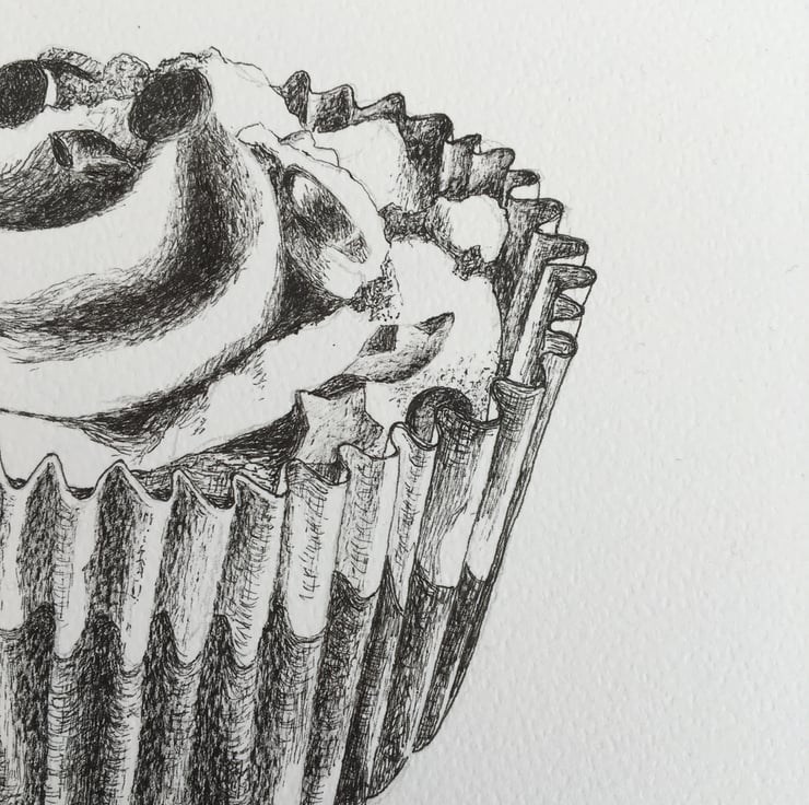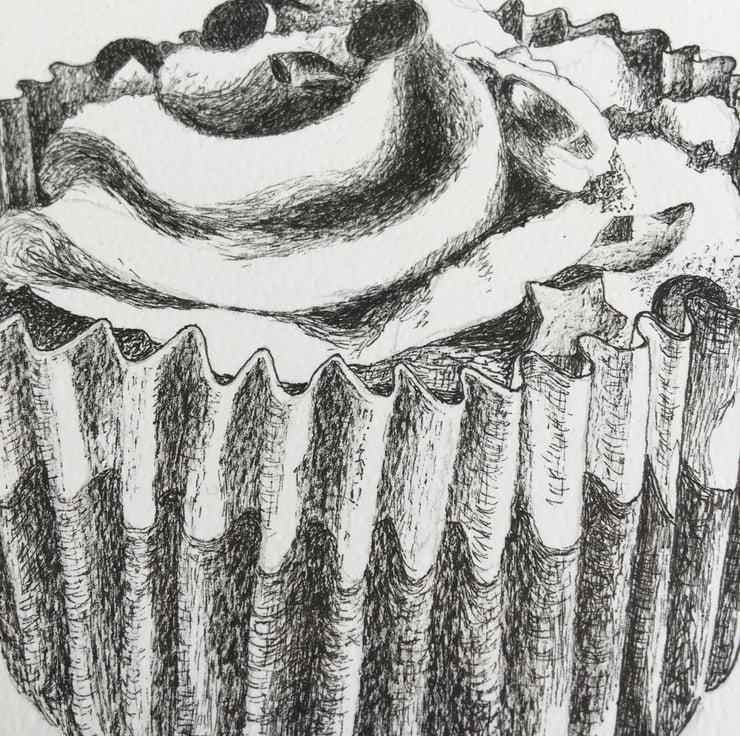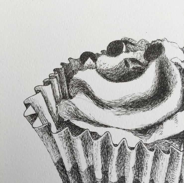 An ink drawing on cold pressed acid free 300gsm artists watercolour paper measuring 29.5cm by 21cm (A4) . The drawing measures approximately 11cm by 10cm . The image is a cupcake made with black ink. An original drawing not a print and would make an ideal gift. The drawing will be sent inside a board back envelope.