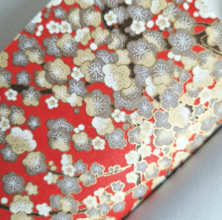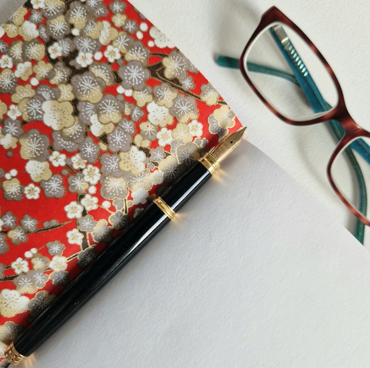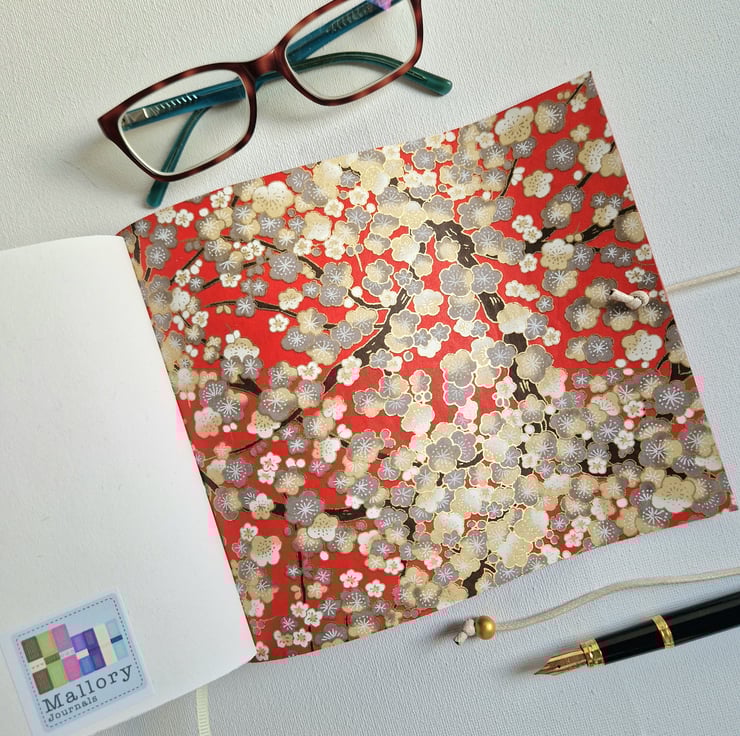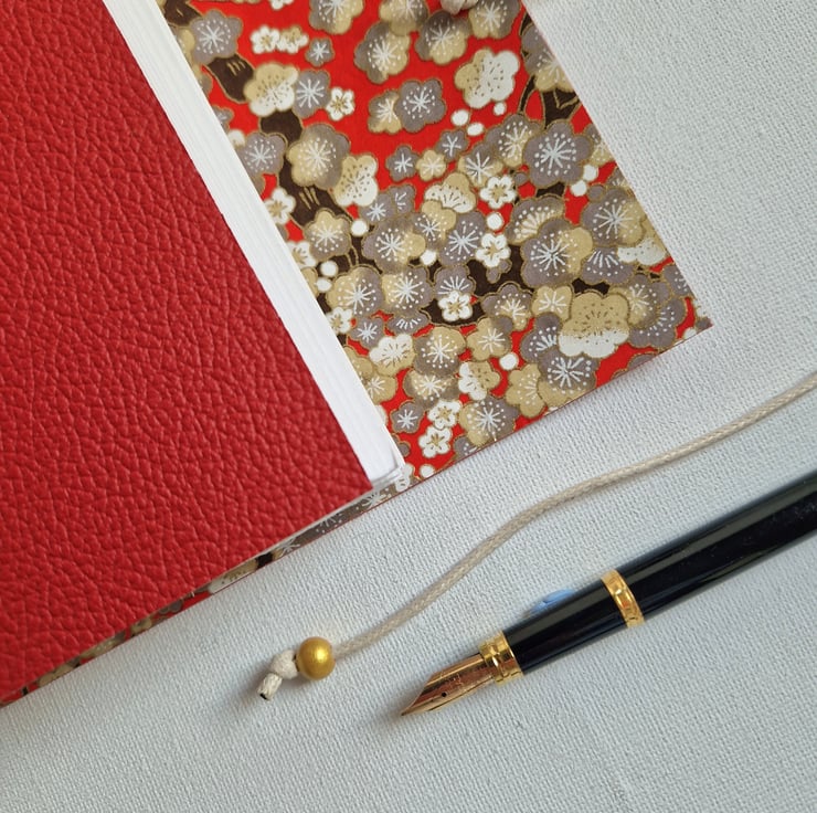 Beautiful Chiyogami Blossom Journal Hand Bound in Red Leather. Perfect for all types of Journaling, sketching, printing or light watercolour.