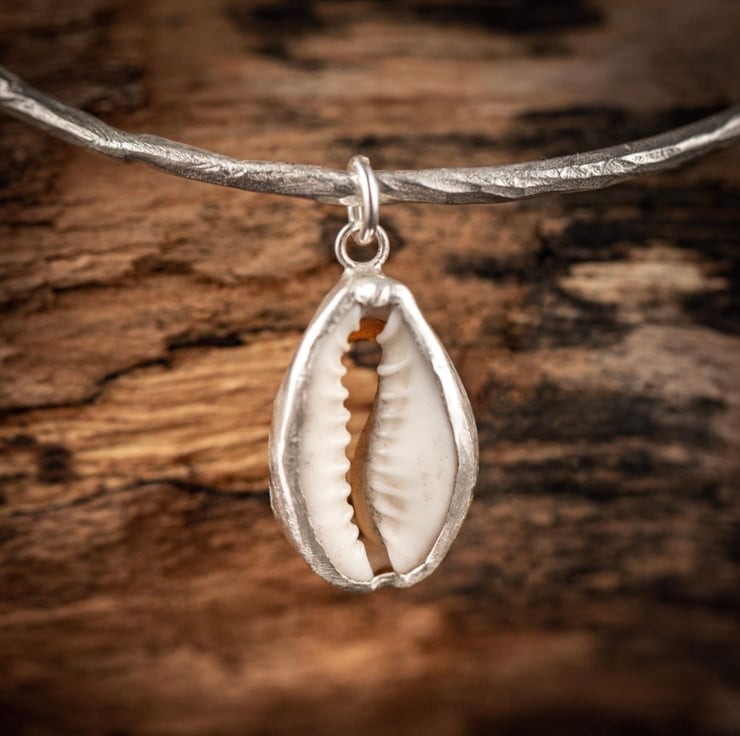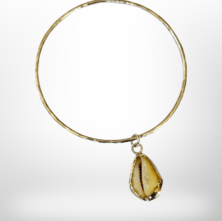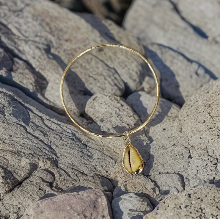 Stunning boho eco-friendlybangle. handcrafted from recycled sterling silver with a hammered finish. Featuring a beautiful Cowrie shell charm delicately framed with fine silver, this bangle exudes elegance and sustainability.