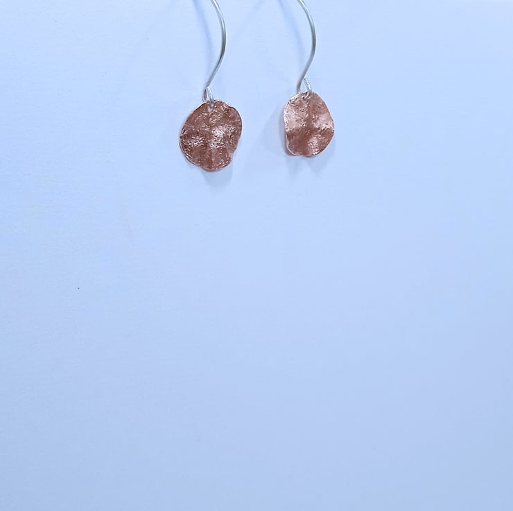I have created these lovely earrings from small copper discs measuring approximately 12 mm which have I have hand cut from copper sheet. I have textured and distressed them to produce an interesting uneven organic design and then polished them.