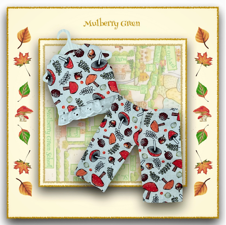A cute little pair of toadstool print pyjamas to fit the Mulberry Green characters. The pyjamas are made from cotton and have a fully lined top, decorated with broderie anglais and matching trouser bottoms. They fasten with poppers at the back.