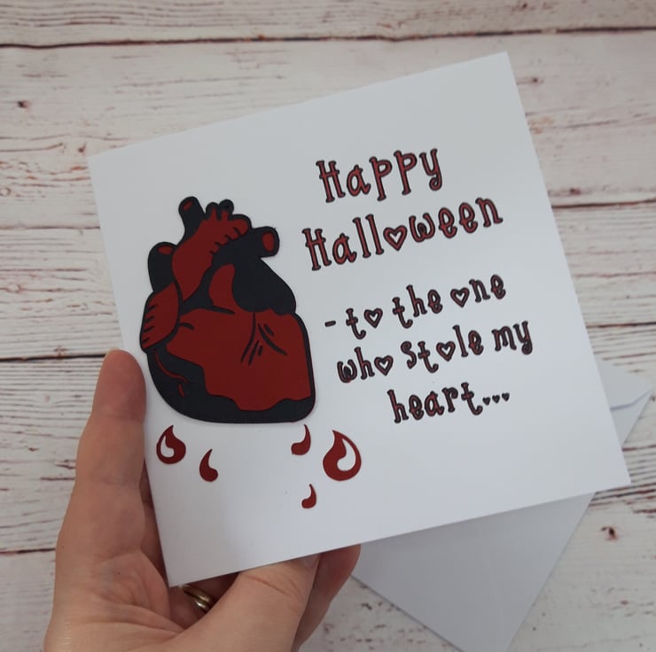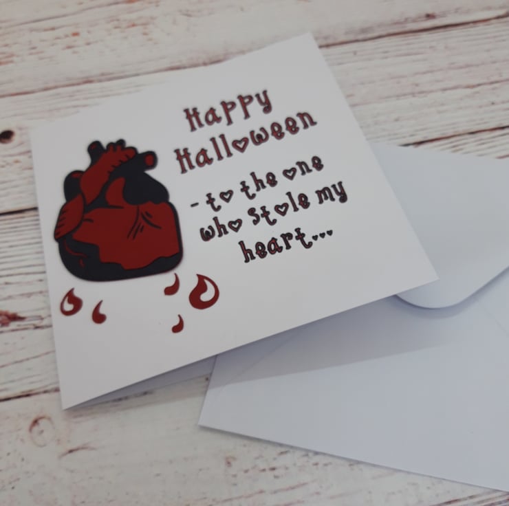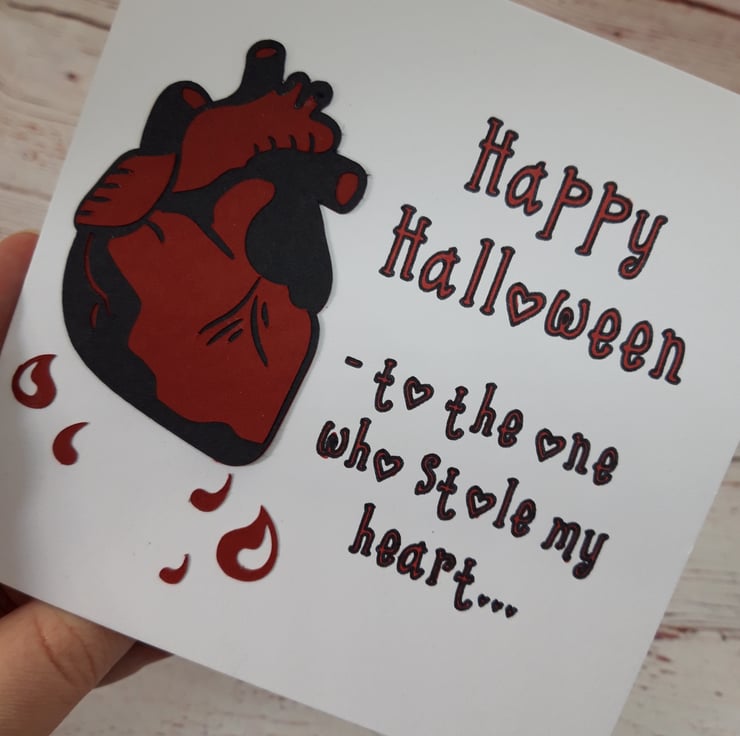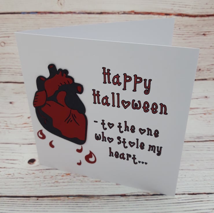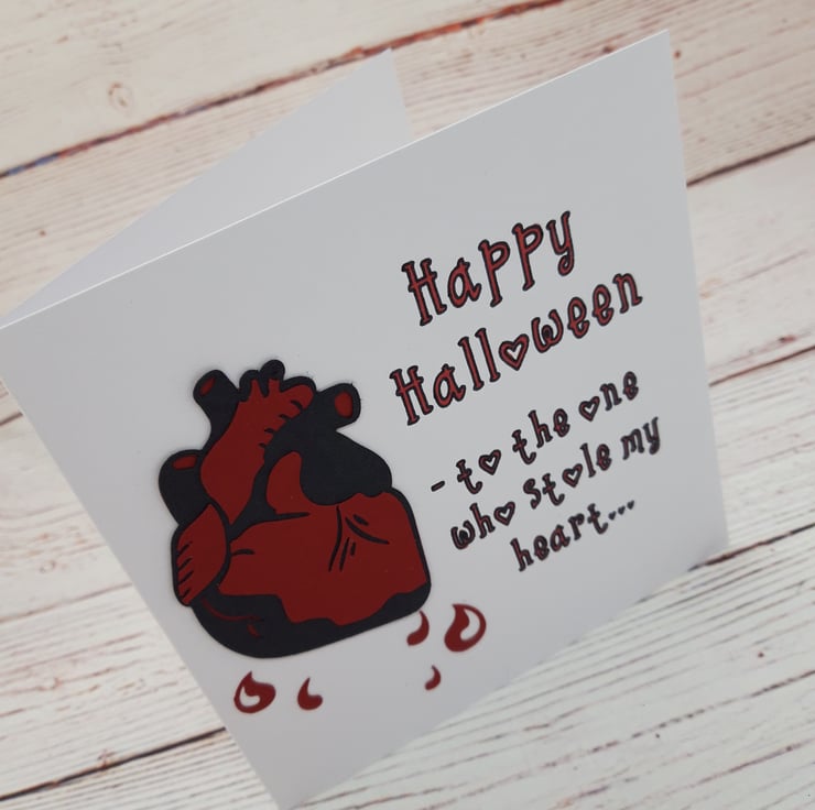Featuring a realistic heart cut from card stock dripping in blood it boldly states 'Happy Halloween - to the one who stole my heart'