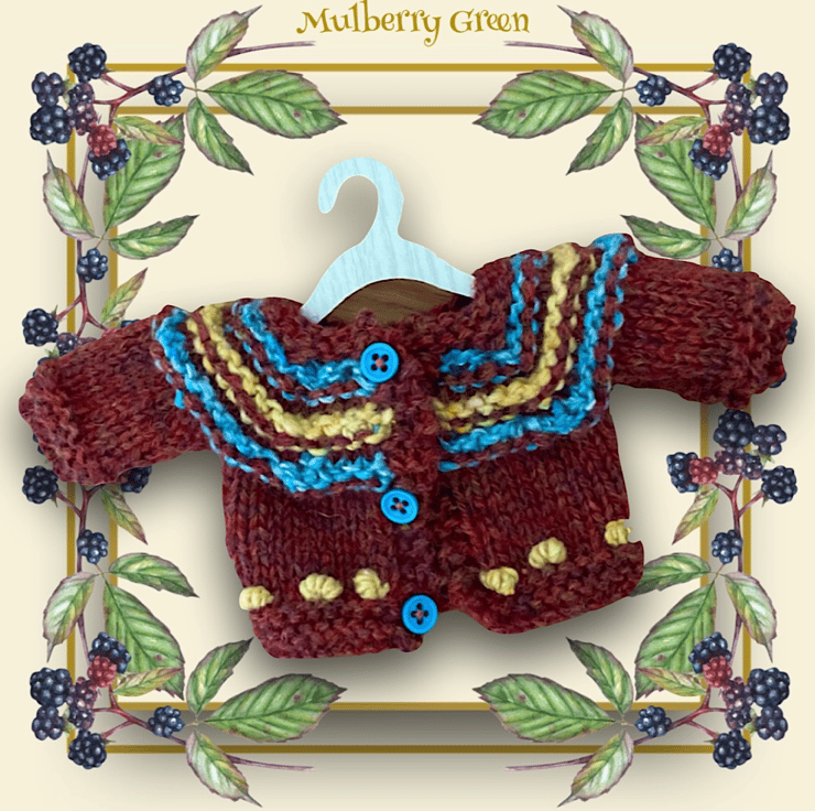 A cute little rust cardigan with a patterned yoke, to fit the Mulberry Green characters. The cardigan is hand knitted in pure Icelandic wool and is finished with a little turquoise buttons.