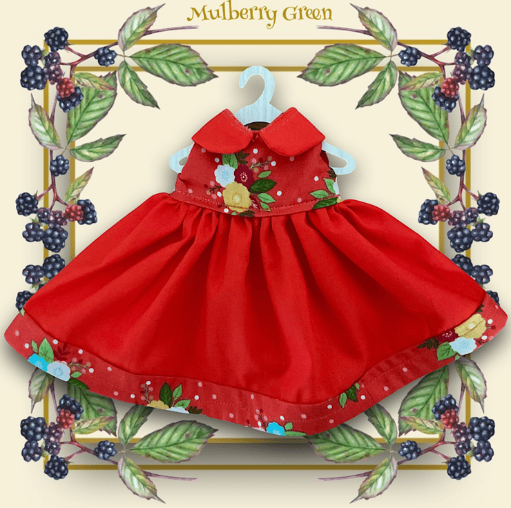 A little orange dress with a floral bodice and trimmed with floral fabric at the hem to fit the Mulberry Green characters. The dress is made from best quality cotton and has a full skirt and a lined bodice.