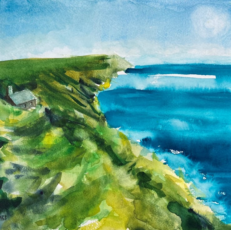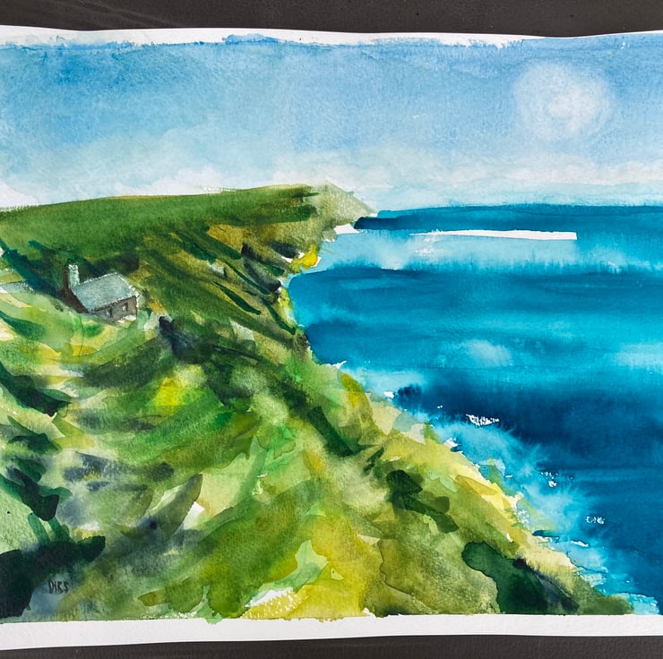A watercolour painting of the east coast of Lundy Island, off the Devon coast, south west England. Signed by the artist. UNFRAMED. Approx. dimensions: 34cm x 30cm