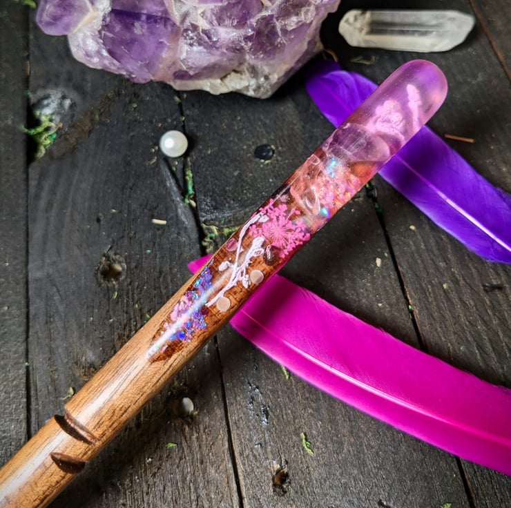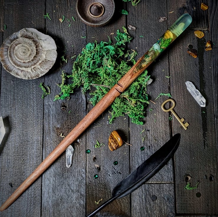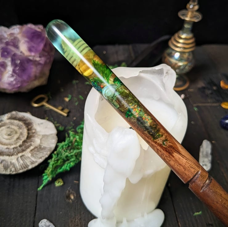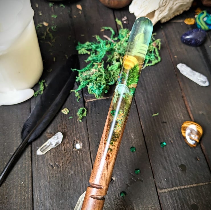 We've been so lucky to create many wonderous wands, we especially love combining wood work with resin to make something really unique and striking. The Eternal wand offers such a unique item and we really enjoy taking the time to place and arrange a perfect piece of art before forever sealing it in resin. This wand really does feel like it captures something magical and we hope the magic folk which choose this wand can feel that too!