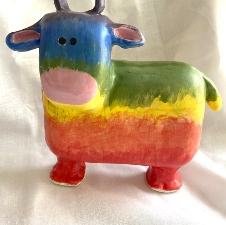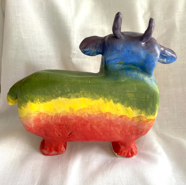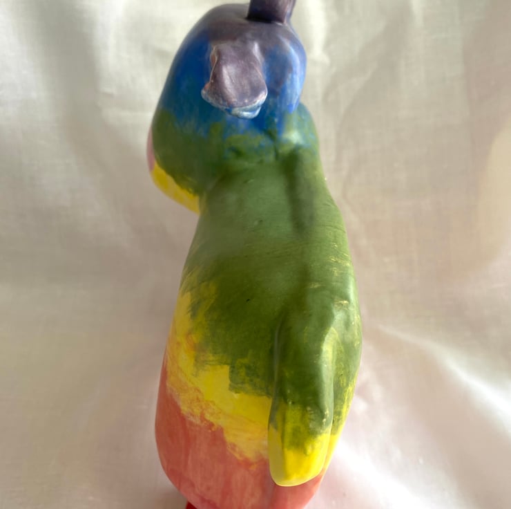 He's one of a kind! Made from earthenware clay, fired, glazed in all his colours and then fired in the kiln again. He's looking for a loving home and would make a great gift for yourself or someone you love.