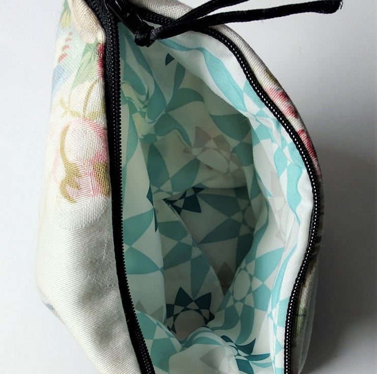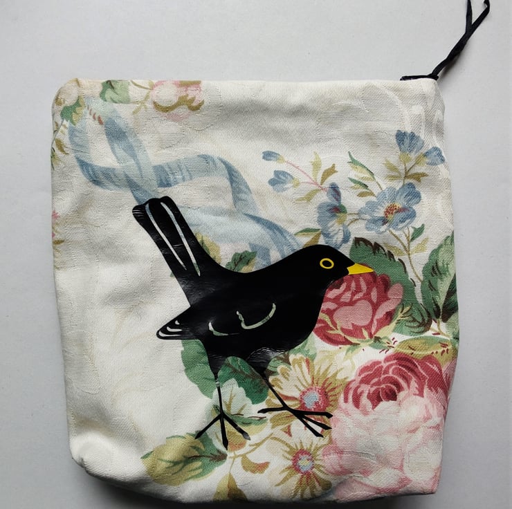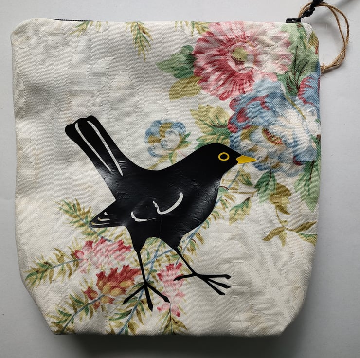 The vinyl print on these bags is made from one of my original blackbird drawings, scanned in and converted to a cut out! The bags are made from a lovely floral cotton furnishing fabric and lined with an upcycled shower curtain for water resistance which makes them perfect as make up or toiletry bags. The bags have 'squared' bases to give them a bit of structure and fasten with a zip. They measure around 20 x 15 x 5 cm.