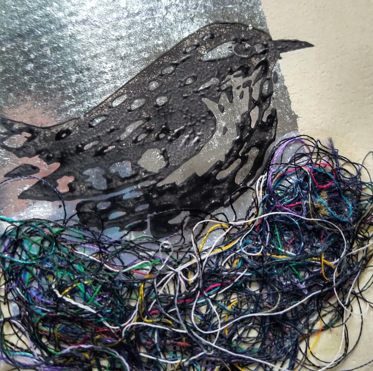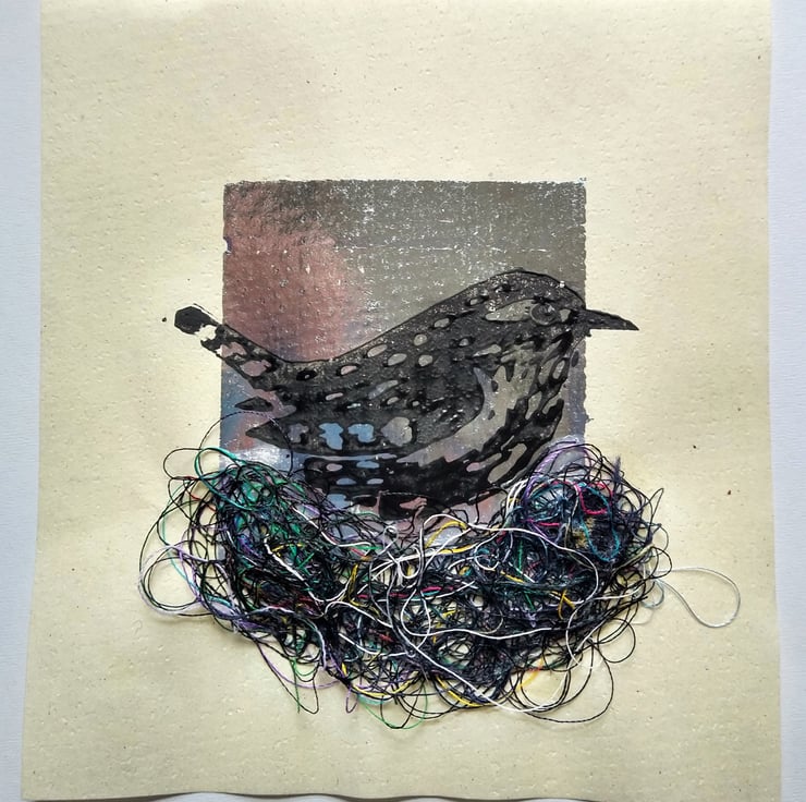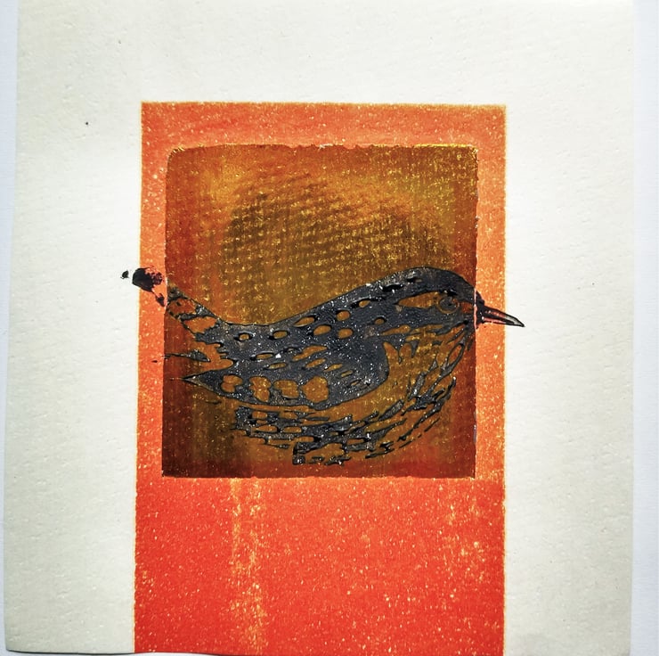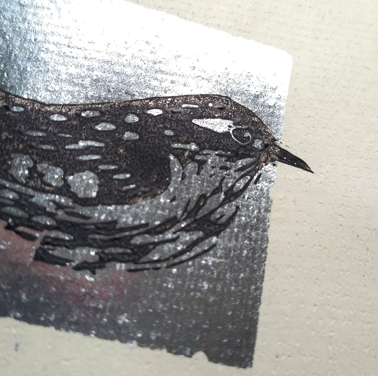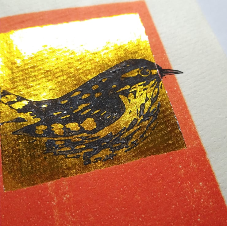 This lovely little lino cut print was inspired by the small but very loud wrens patrolling the woods near my house. Printed onto beautiful delicate paper with metal leaf, there is a version on silver and one on gold coloured leaf, please select from the drop down menu. There is also a version with a little collaged thread nest! The print is around 12 x 12 cm and is mounted onto a piece of mountboard 15 x 15cm. The print will arrive carefully wrapped in a bio-degradable cellophane wrapper to protect it.