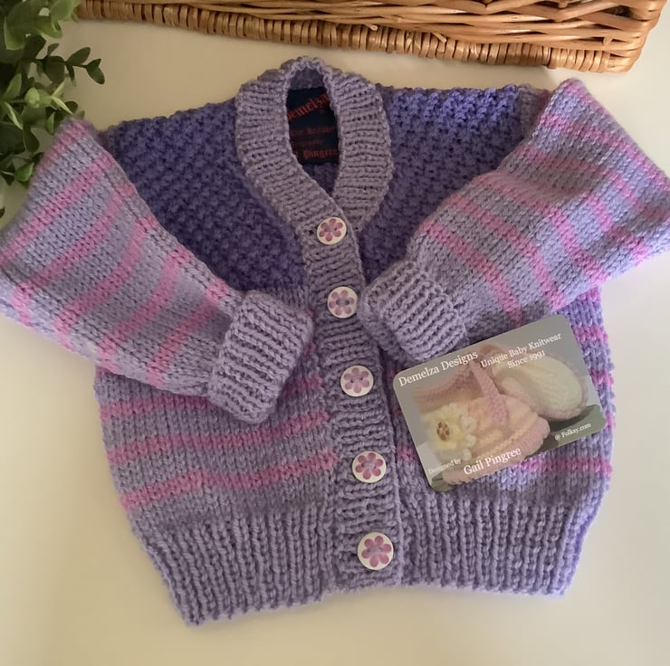 A unique eye catching practical baby girl's cardigan designed and totally hand crafted using quality branded machine washable yarns. The buttons are made from genuine wood with a delicate flower design on them. The branded Demelza Designs garment label is attached to the back neck edge with the care instructions woven within it on the reverse side for lasting reference. A Demelza Designs garment swing tag will be attached to the front prior to dispatch for a professional touch if gifting.