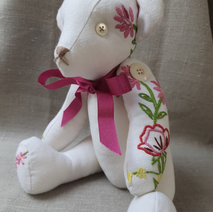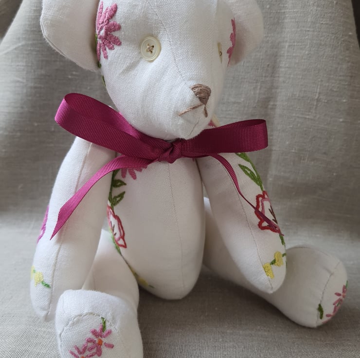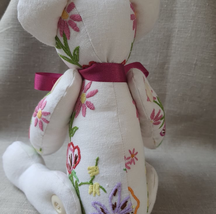 Meet Flora - a lovely little girl bear made from vintage floral embroidered fabric! Flora measures 33cm tall (13 inches in old money!) and would love to share your home.