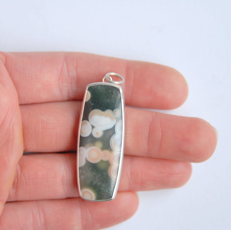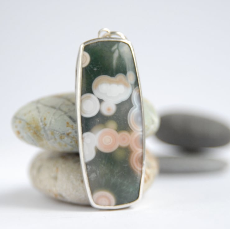 This oblong pendant features a stunning piece of ocean jasper with a pretty pattern of peach and cream orbs on a mossy green back ground. The ocean jasper is bezel set in sterling silver and is finished off with a simple loop bail and 18 in silver snake chain. The jasper switches from having a micro crystalline structure to more of a macro crystalline structure towards the bottom of the pendant and if you look closely you can see where the crystals mesh together (it is an open backed setting so you can hold it up to the light and see the crystal structure better). The oblong shape is gently round rather than sharply angular. Measures 52mm (inc bail) by 17mm and comes gift boxed.