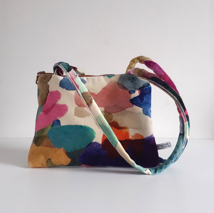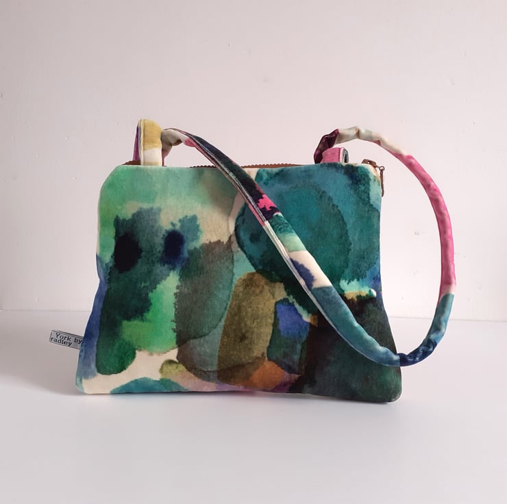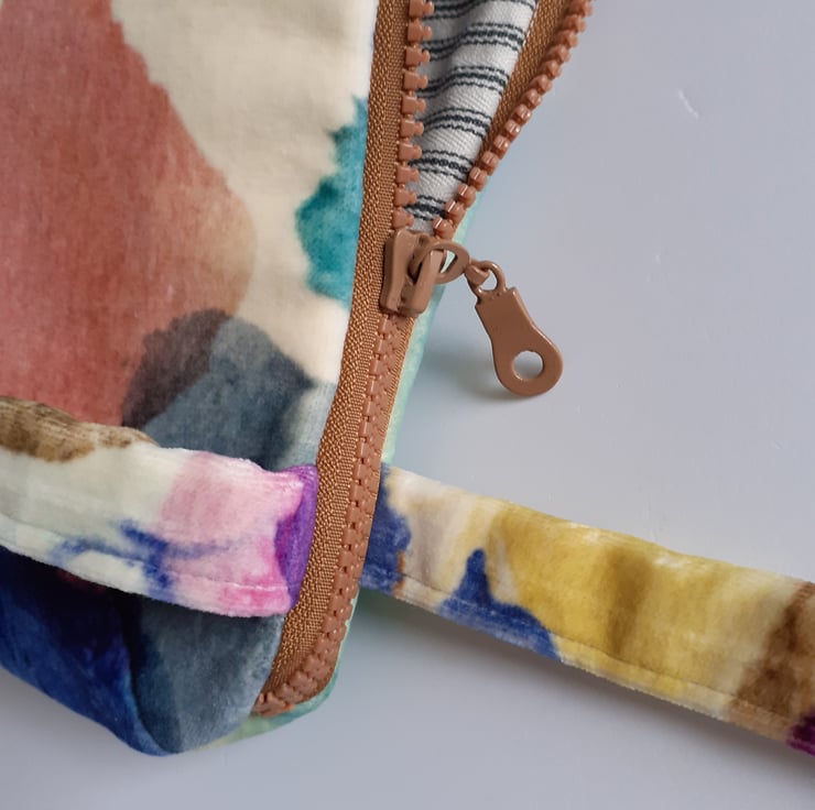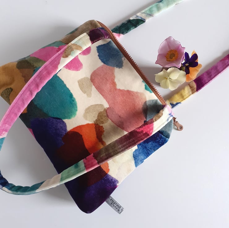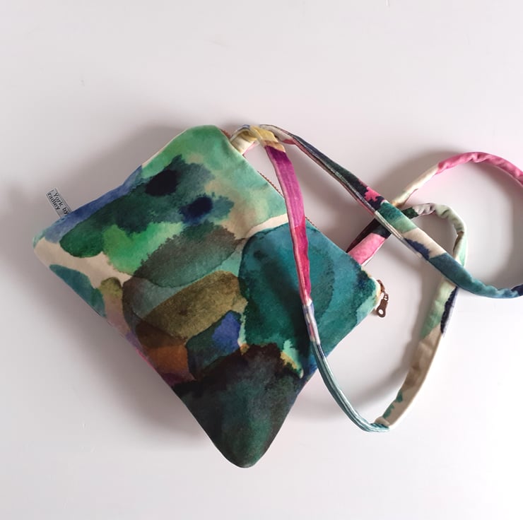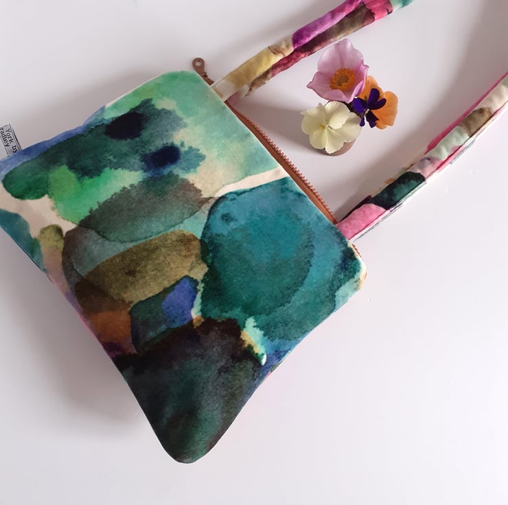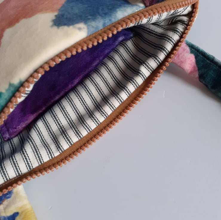 This neat little velvet handbag, in a watercolour print is still roomy enough for all your essentials (and a little bit more! ) It fits snuggly under your arm, but is large enough to carry your essentials with style, and closes with a satisfying chunky zip. I designed and made it from a wonderful designer velvet remnant which I spied at the York Car Boot. It is a beautiful pattern, printed to resemble a watercolour wash of jewel like colours.