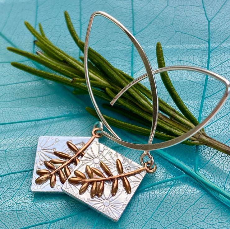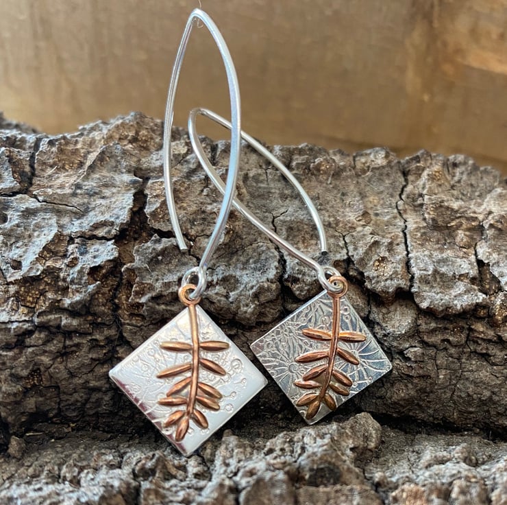 Sterling silver and copper Drop Earrings with Fern detail.