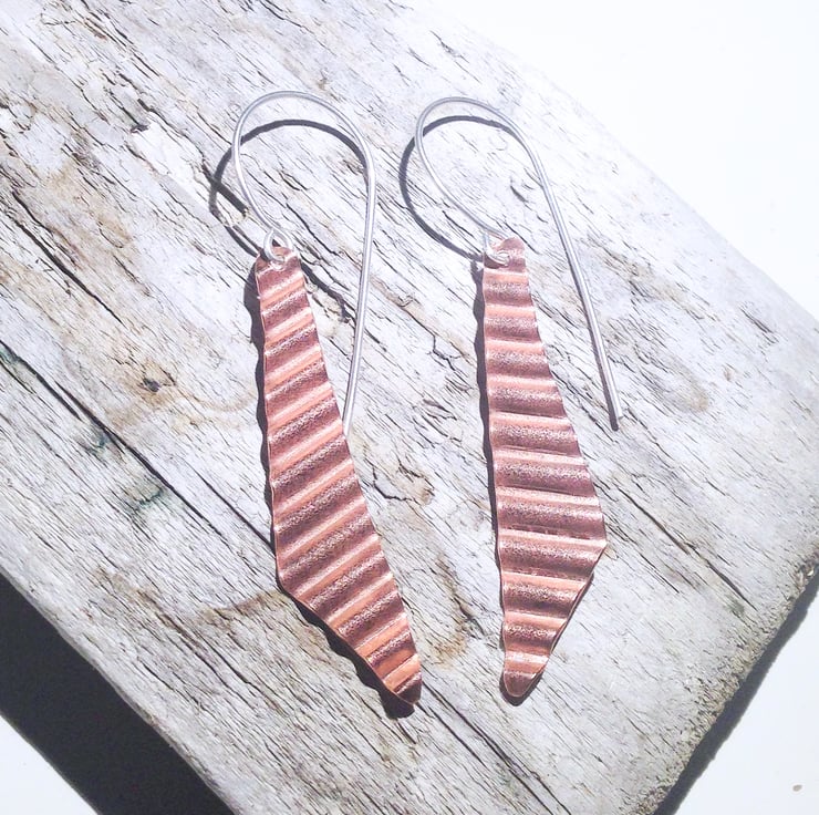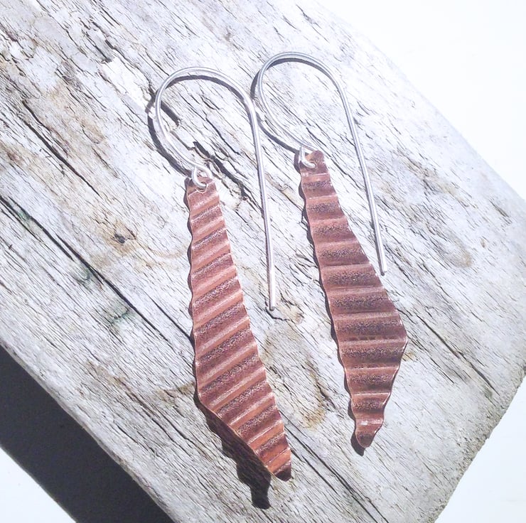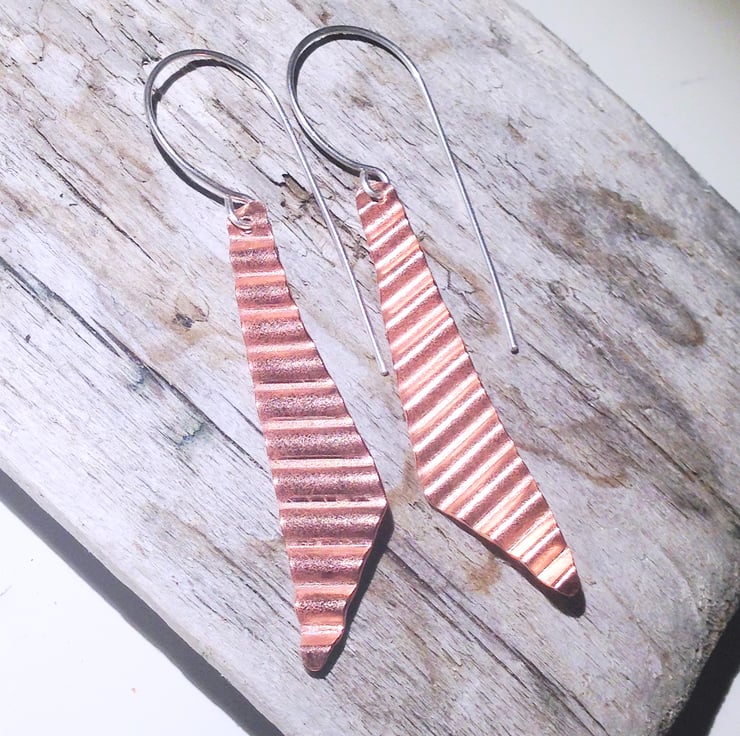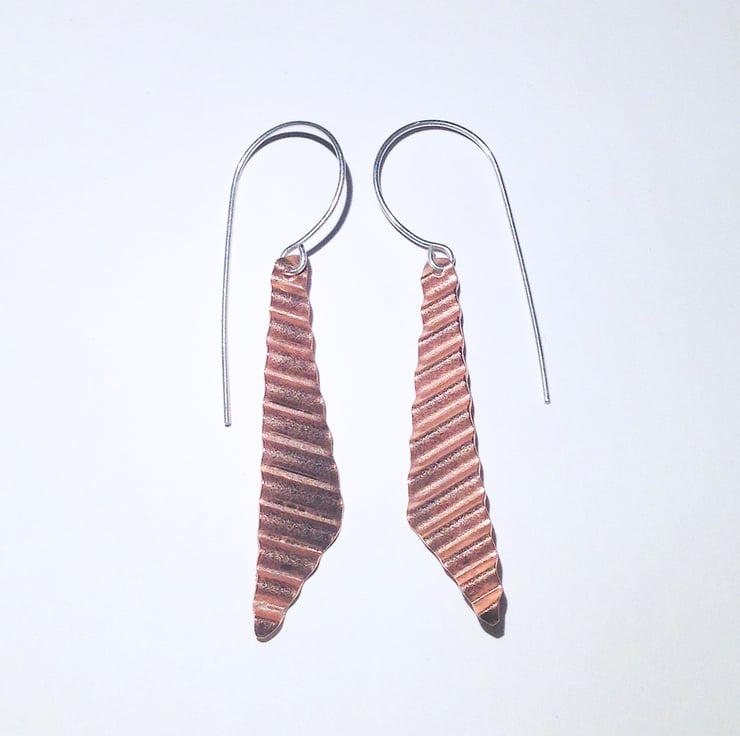 These lovely earrings have been handcrafted from copper which has been repeatedly hammered and then corrugated to create interest.