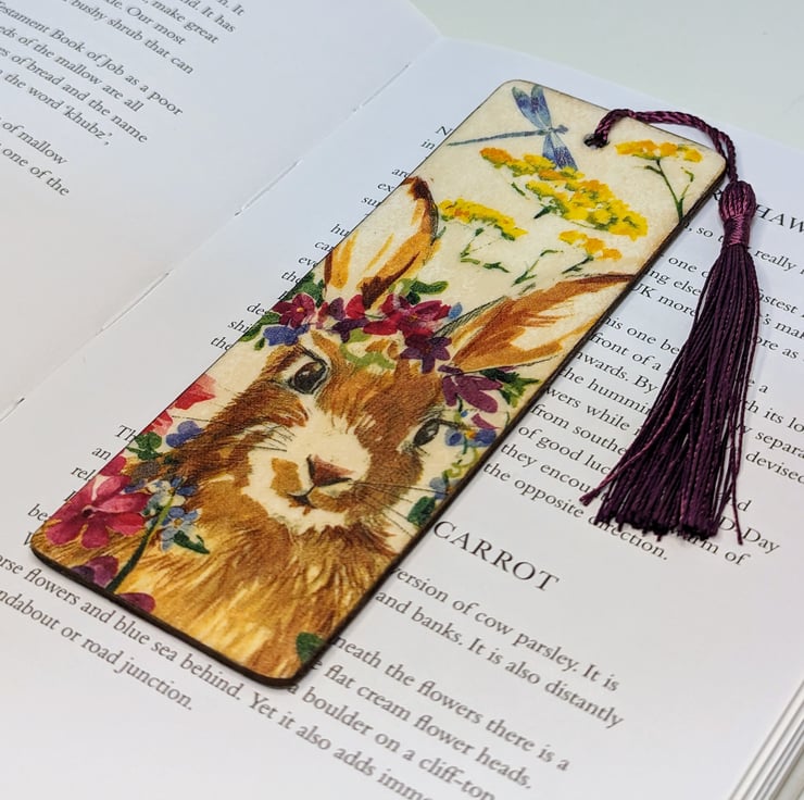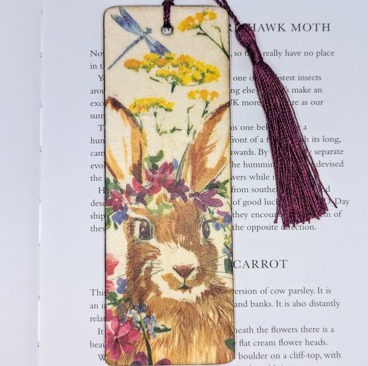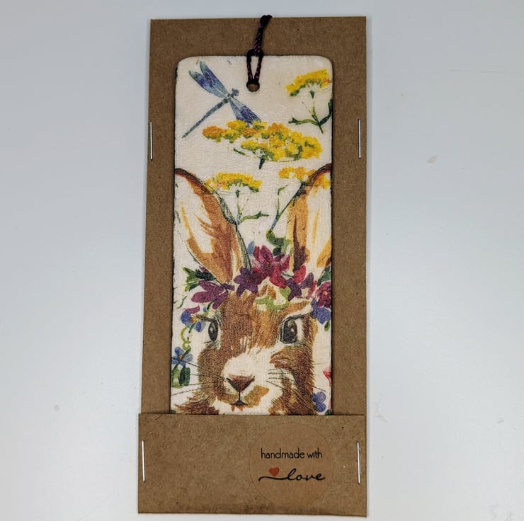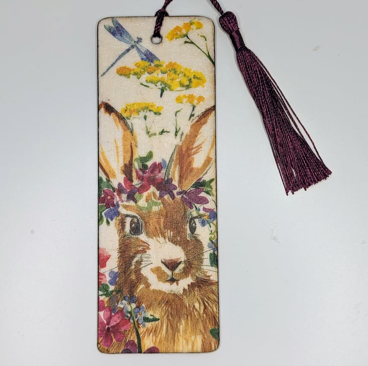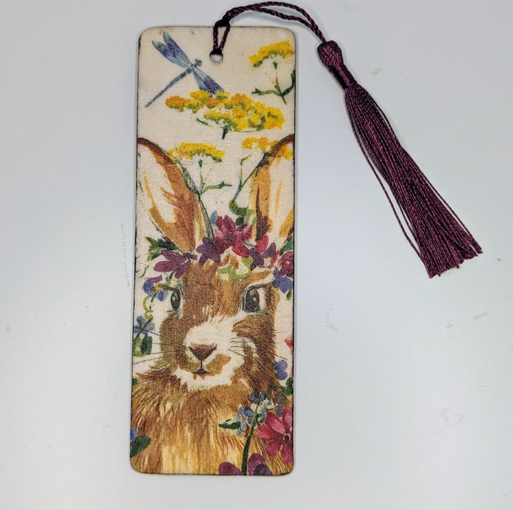 Pretty bookmark, made of wood, which has been decoupaged with a rabbit and flowers design on both sides. The bookmark has been sealed and finished with a purple tassel.