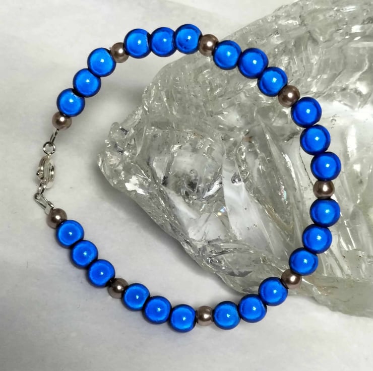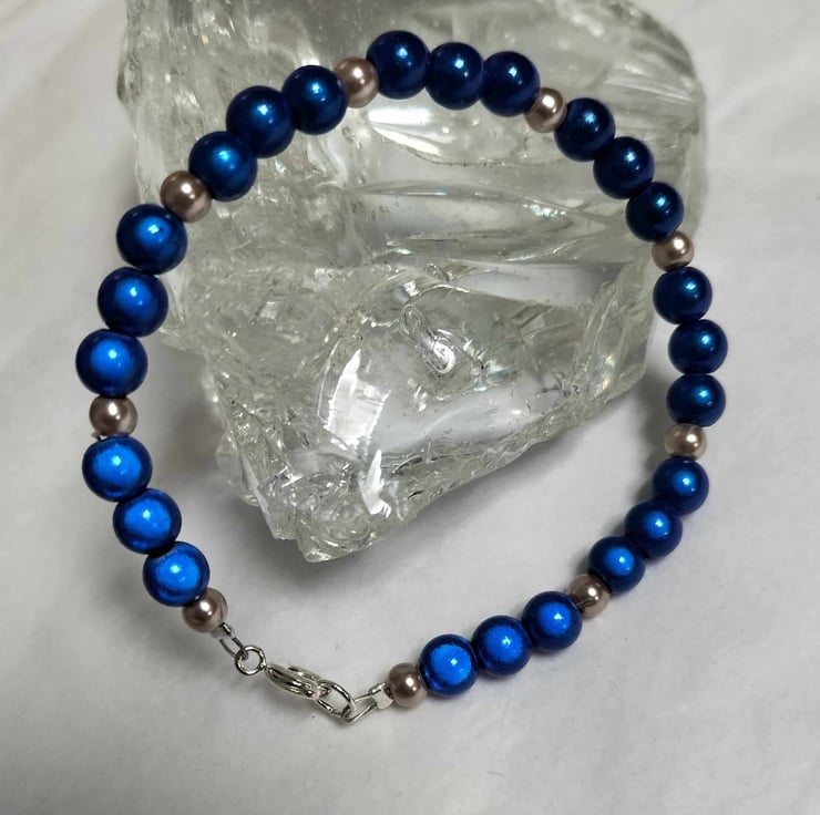This stunning bracelet is 7.5" long using 4mm champagne faux pearls and 6mm blue miracle beads .