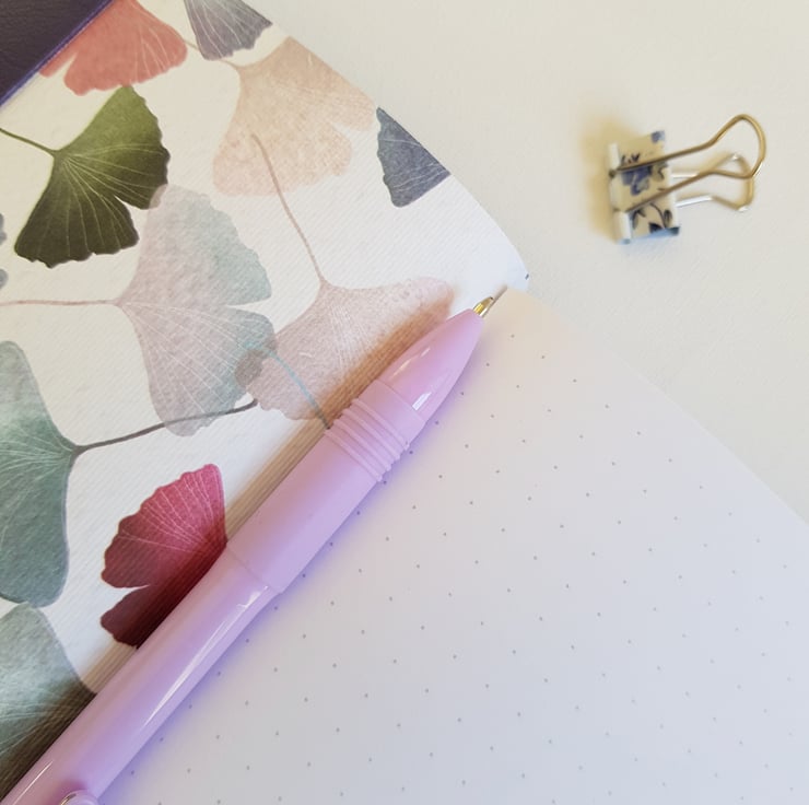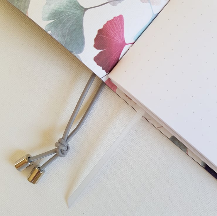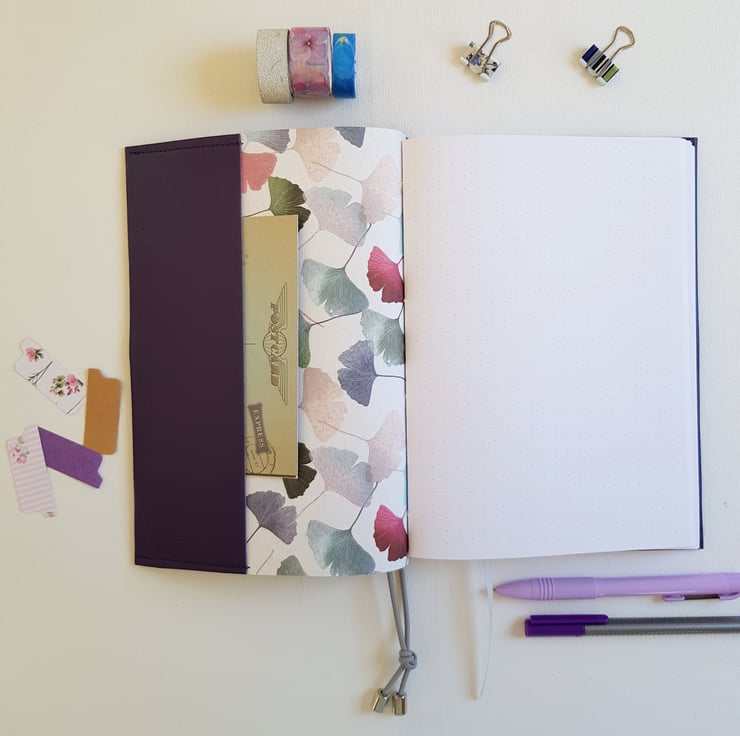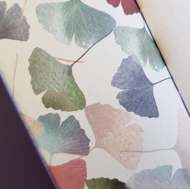 The Journal is lined with a beautiful Gingko paper in subtle colours of pink, purple, grey etc. It has 200 pages of either Dotted or Lined Paper. And I can add a useful elastic pen holder. The closure is a grey elastic, which is pulled around the Journal.