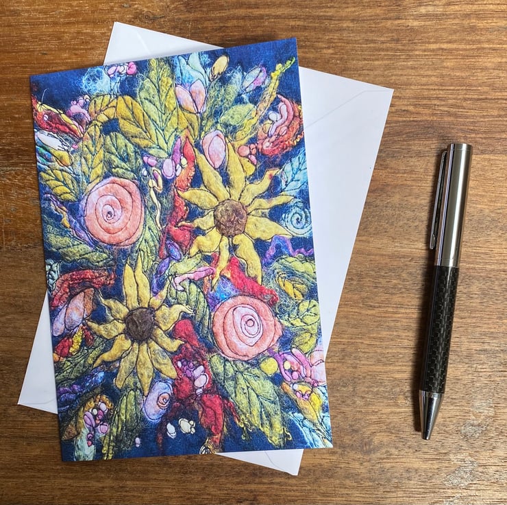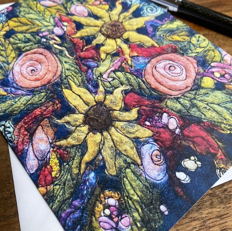 This card is a print of one of my felted pieces with free motion embroidery. This one shows a beautiful bouquet of flowers, including roses and sunflowers. It’s ideal for any occasion. The card measures 12.5 x 18cm and it comes with a white envelop in a plastic cover for protection.
