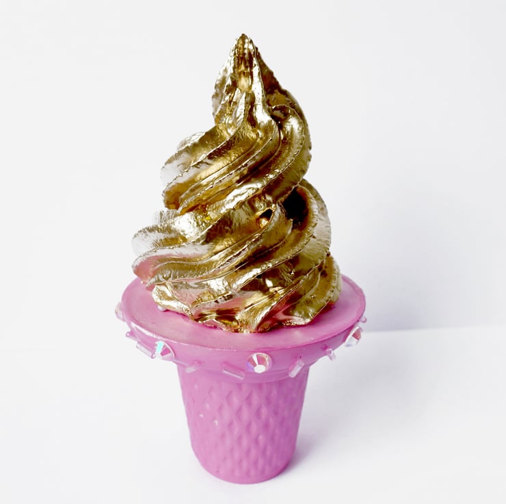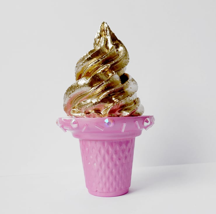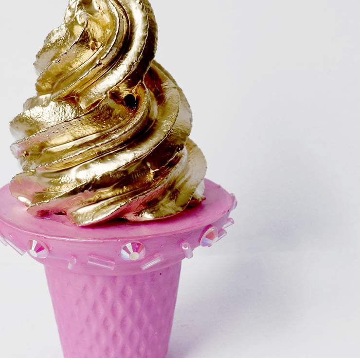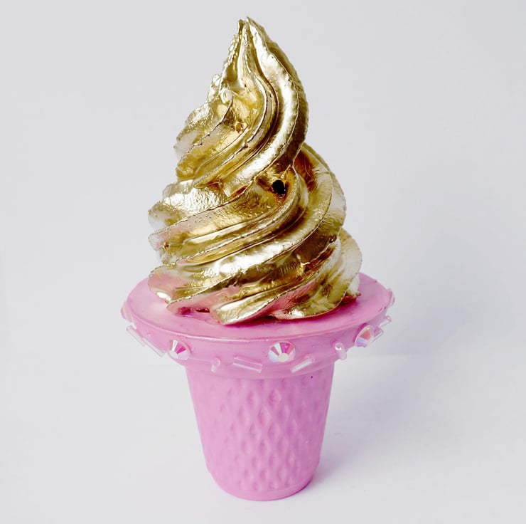 This fake ice cream cone is painted in a deep sugar pearl pink and topped with a generous dollop of gold fake whipped ice cream.