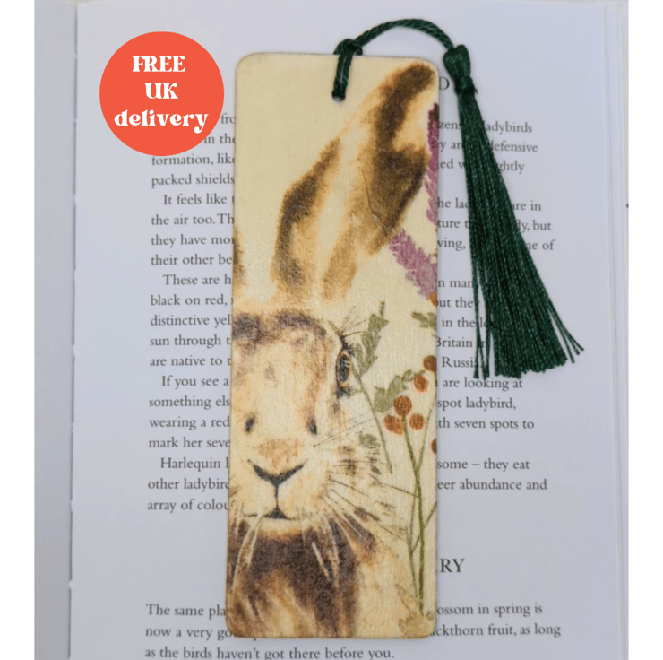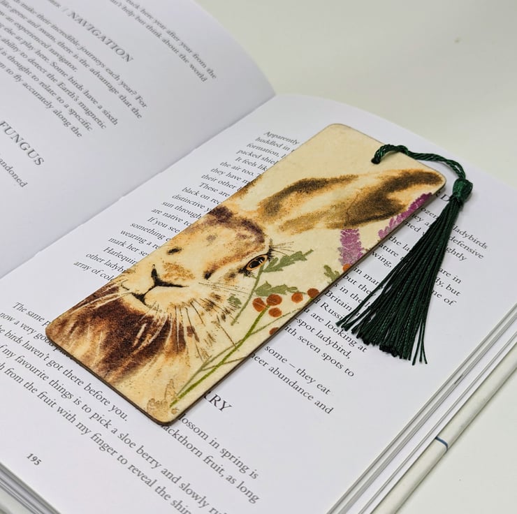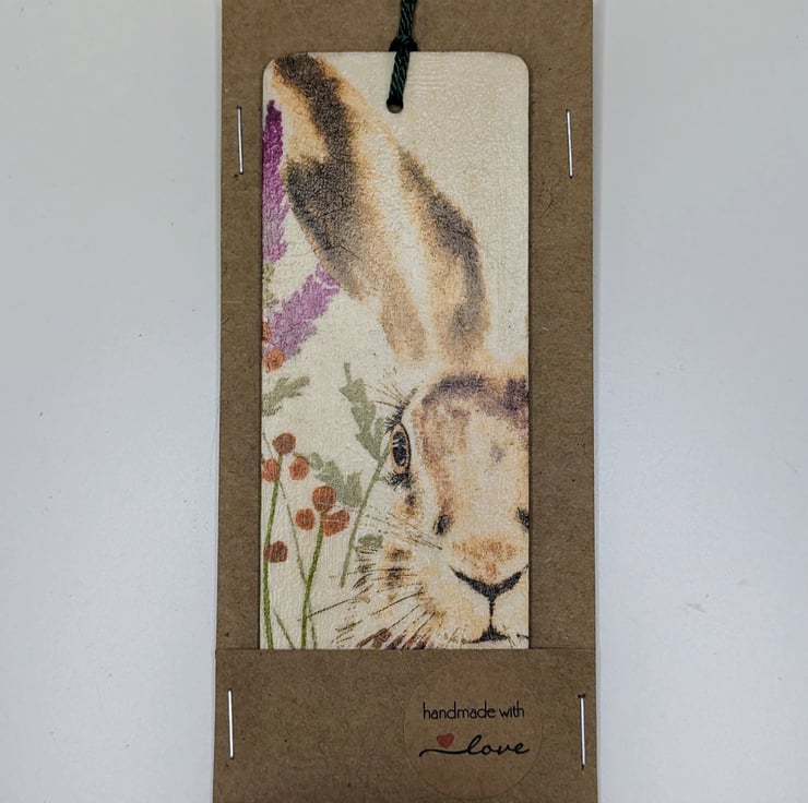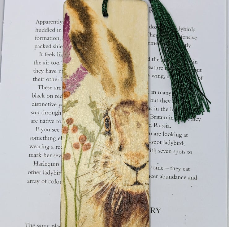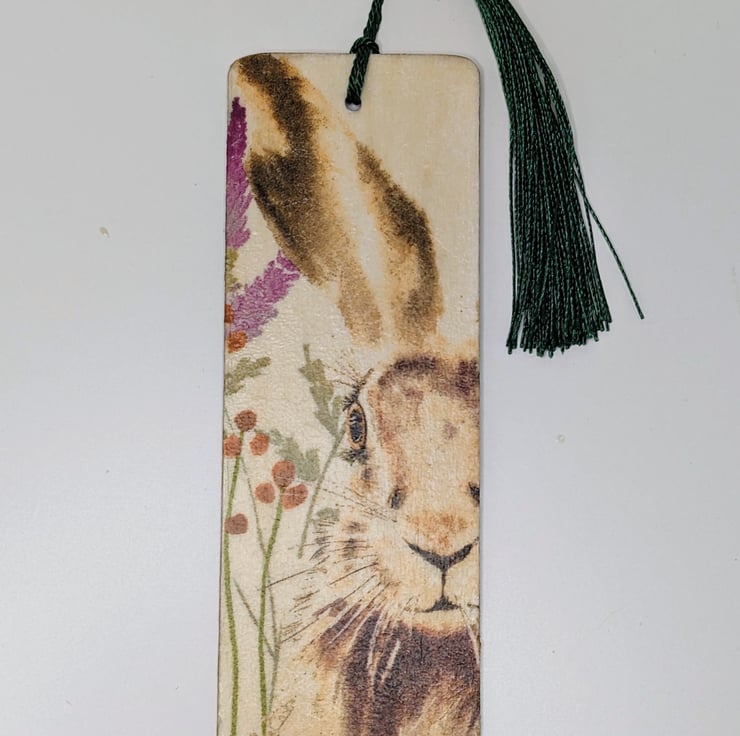 Hare bookmark, made of wood, which has been decoupaged with a beautiful hare and wildflower design on the front. The back has been left plain. The bookmark has been sealed and finished with a tassle.