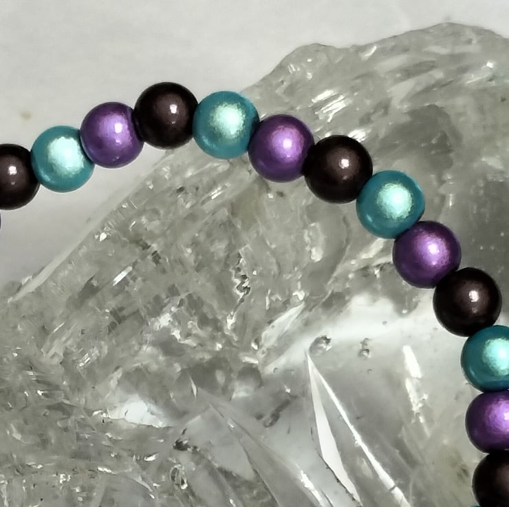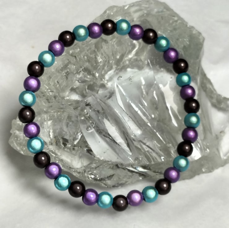 This shimmering bracelet is 7.5" long and has 6mm turquoise, purple and black miracle beads thread onto elastic .