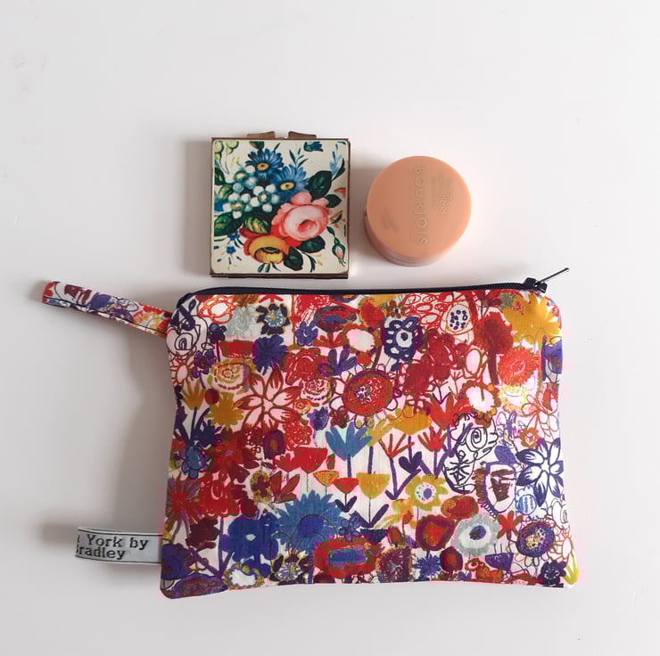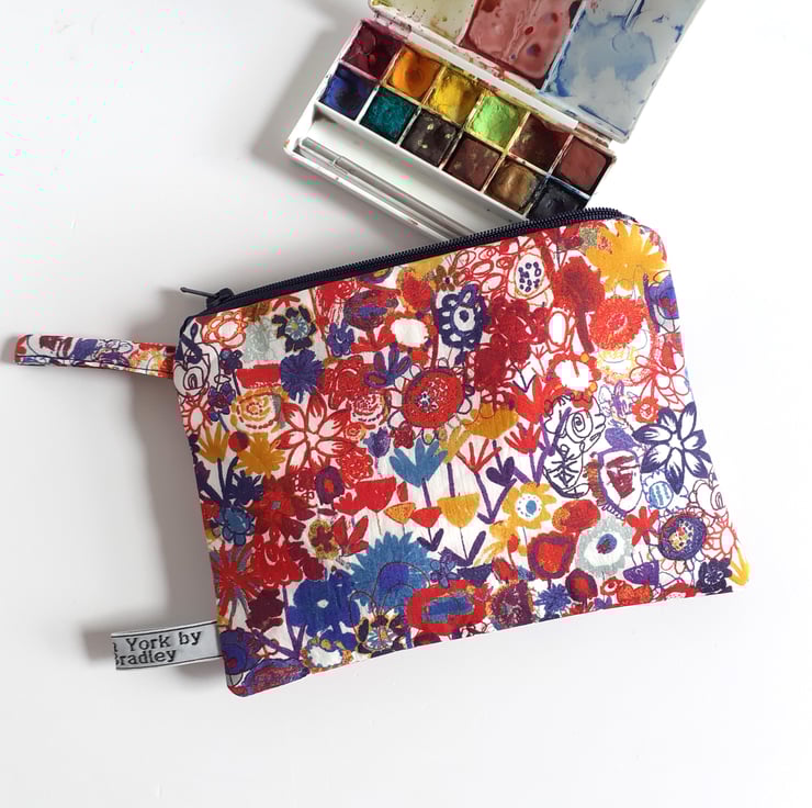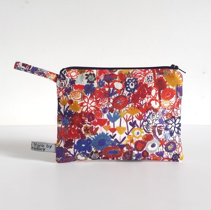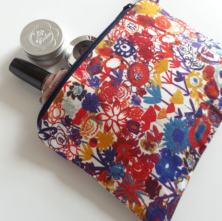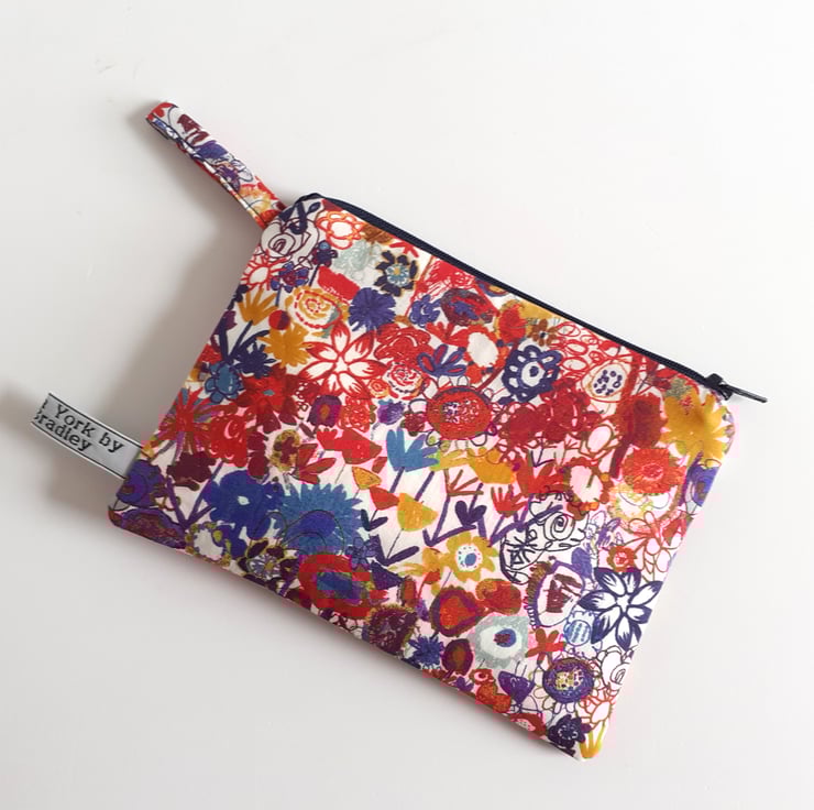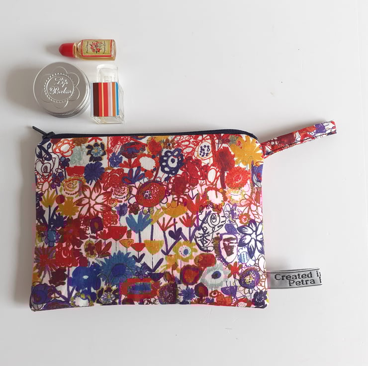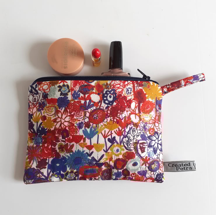 A make up bag or purse in a Liberty print of hand drawn squiggles and doodles. Perfect for use as a make up bag or coin purse or for catching all those bits and bats that float around inside your tote bag. With its unusual colour combination of oranges and purples, it would make a lovely present for a creative friend or a budding artist.