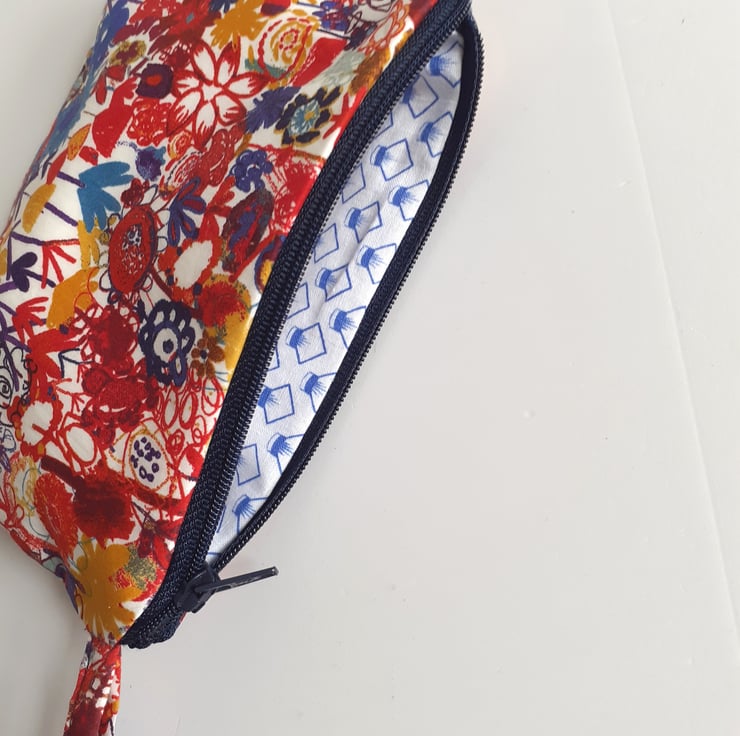 Look no flowers! Birmingham market comes up trumps with this very different Liberty fabric. I love the strong colour combination and the freedom of those squiggles. Make up bag, headphone detangler, coin purse or for catching the flotsam and jetsam inside your handbag, these little purses are useful all rounders.