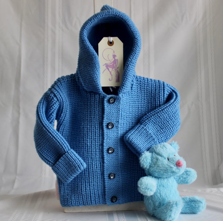 A handmade hooded jacket ideal for a little boy aged between 3 and 6 months old. I began making and selling these lovely items with the birth of my first grand-daughter nearly seven years ago. although I have been knitting for my family for many years.