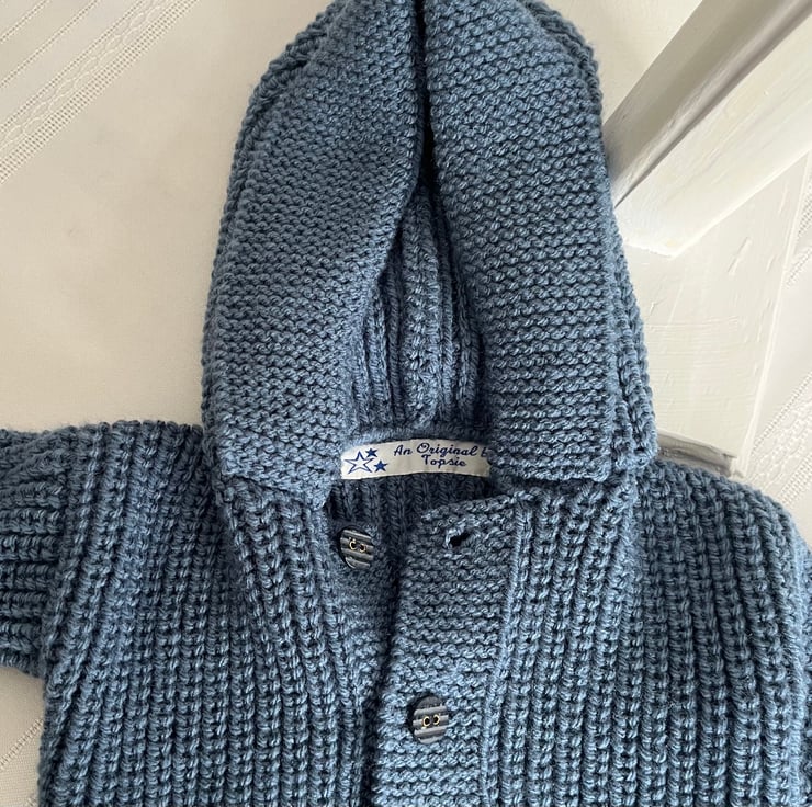 A handmade hooded jacket ideal for a little boy aged between 3 and 6 months old. I began making and selling these lovely items with the birth of my first grand-daughter nearly seven years ago. although I have been knitting for my family for many years.