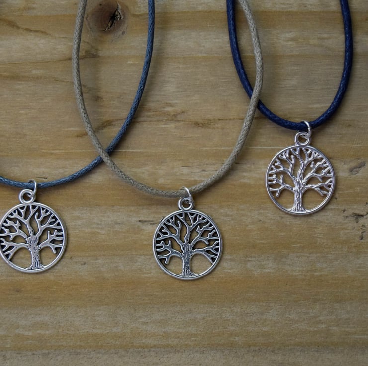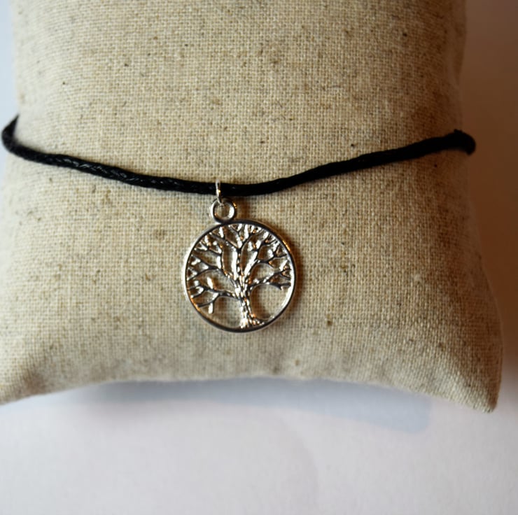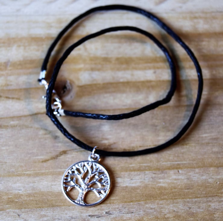 Chunky cord surfer style necklace with an antique silver tone Tree of Life pendant. The Tree of Life is a popular jewellery symbol associated with knowledge and wisdom. Styled to be worn at the base of the neck, available in a variety of cord lengths.