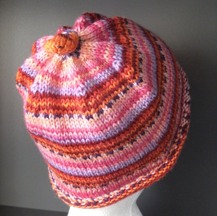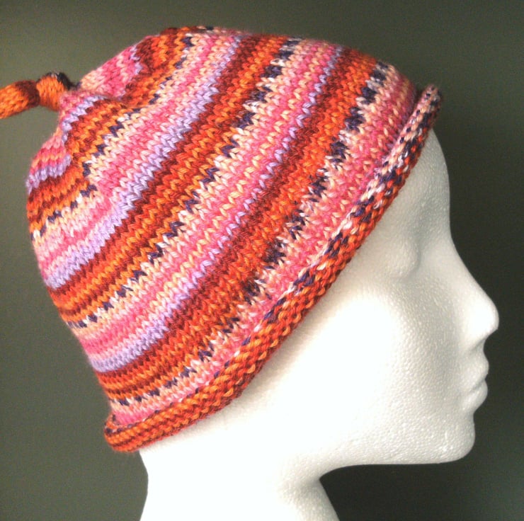 Handknit KNOTTY TOP BEANIE Stripey jacquard in Pinks & Reds child teen adult sma