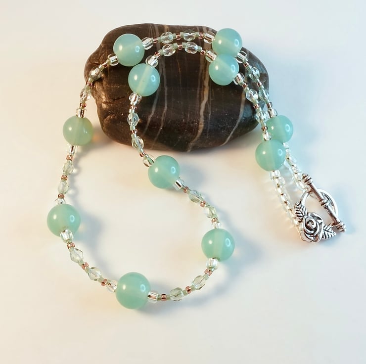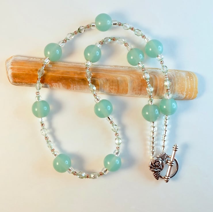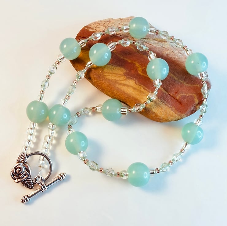 The necklace fastens with a Tibetan silver rose toggle clasp that is nickel and lead free.