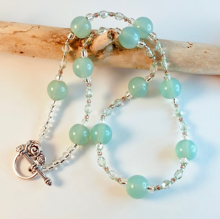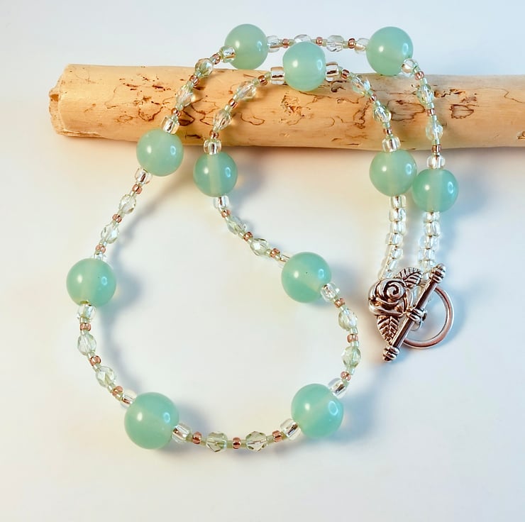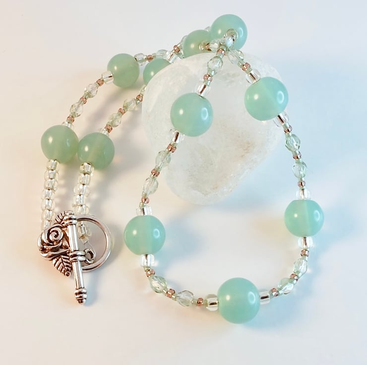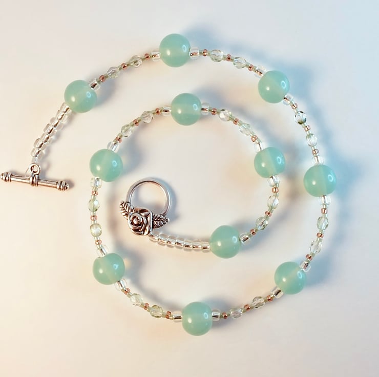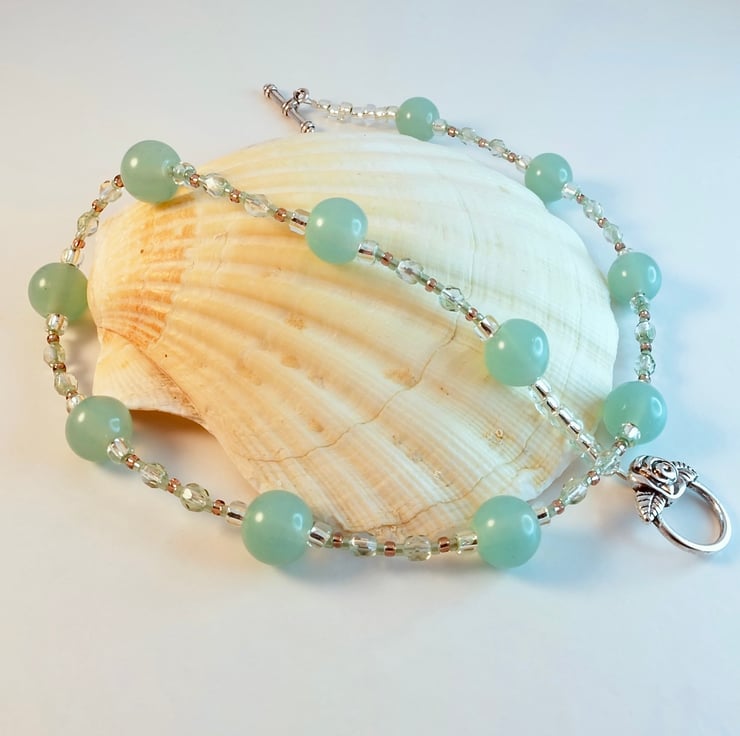 A pretty mix of 12mm sage green glass beads separated by clear, silver-lined seed beads, sparkly faceted glass beads with a hint of mint green, and tiny seed beads in pale teal green and light pink.