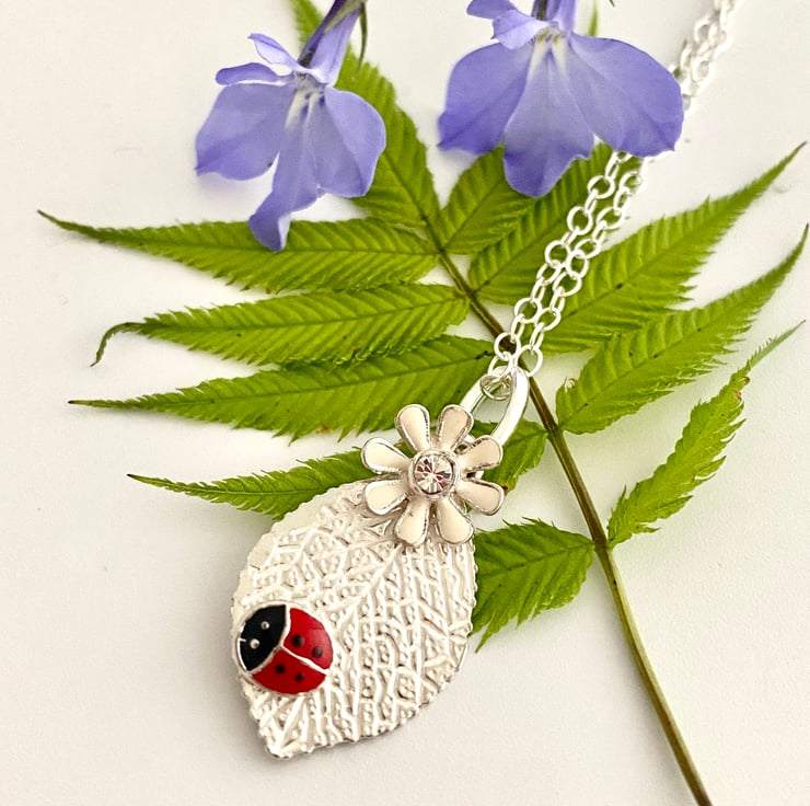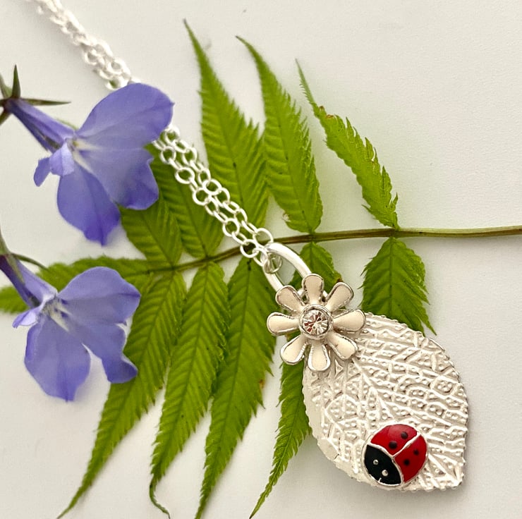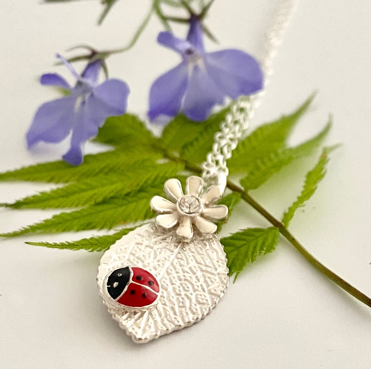 Summer Lady Bird Necklace, Silver Pendant. Daisy Ladybug