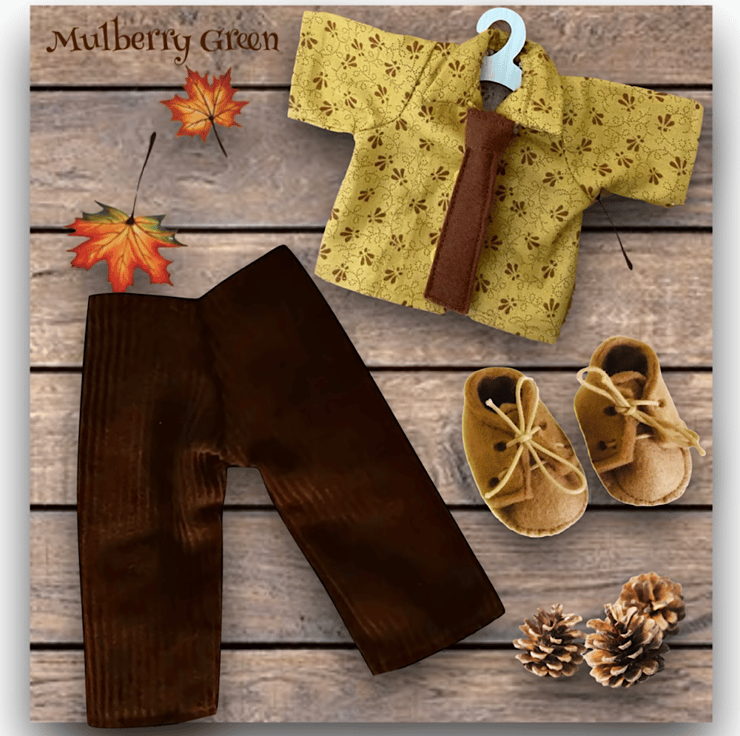 A cute little shirt to fit the Mulberry Green characters. The shirt is made from best quality cotton and has a matching elasticated tie. The shirt fastens with poppers underneath the buttons and looks lovely with the cords or jeans.
