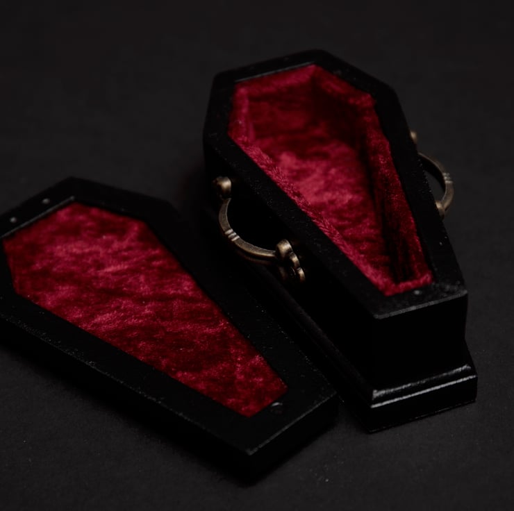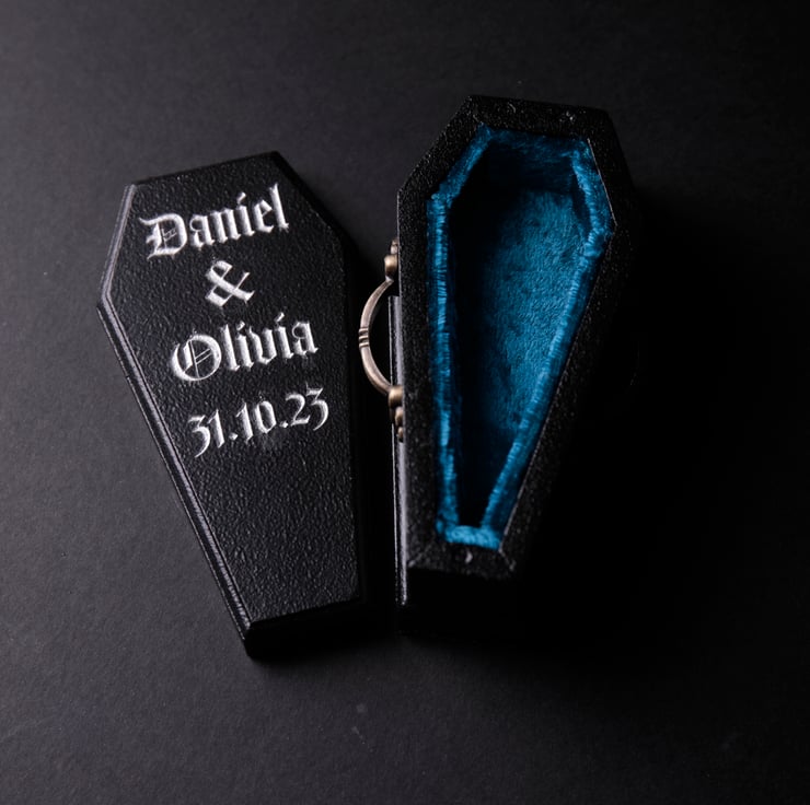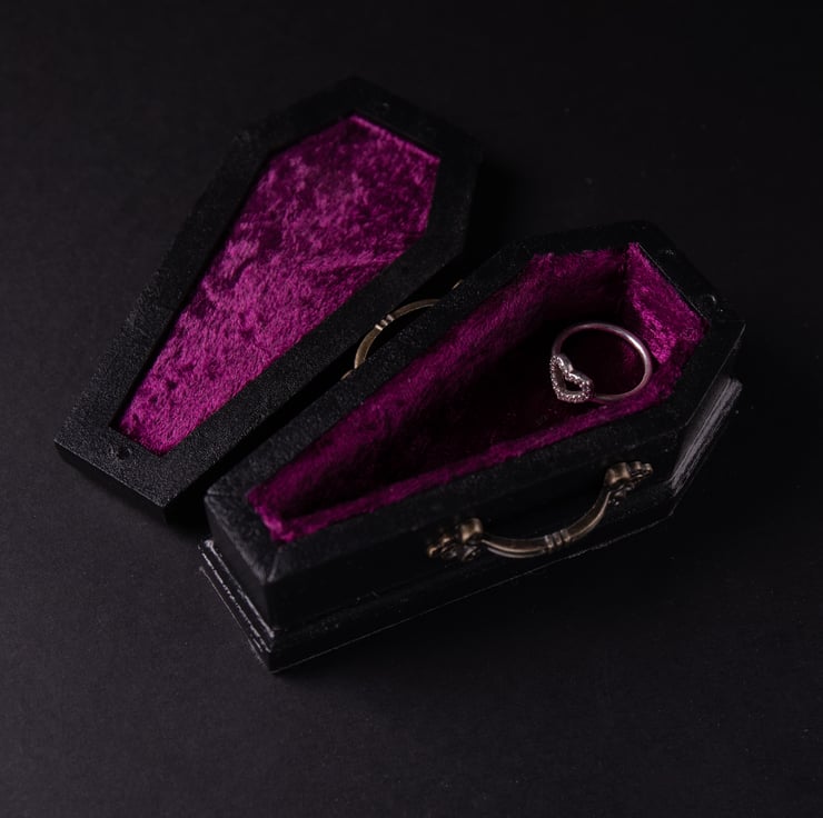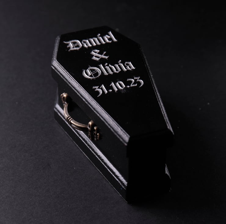 Our coffin-shaped engagement/wedding box is the perfect way to show your undying love for your significant other. Handcrafted with attention to detail, this item is the ultimate symbol of your unique and unconventional love.