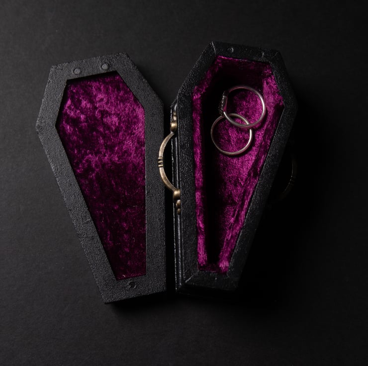 Whether you're planning a gothic wedding or just want to add some dark flair to your engagement ceremony, this coffin-shaped item is the perfect choice. It can be used as a ring box or a unique centerpiece for your ceremony or reception.
