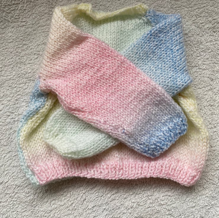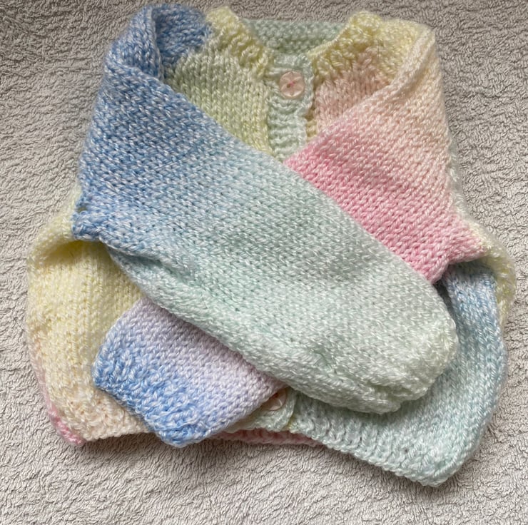 A lovely, colourful cardigan for a little lass, in a blend of soft pastel shades.