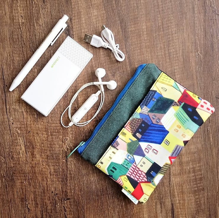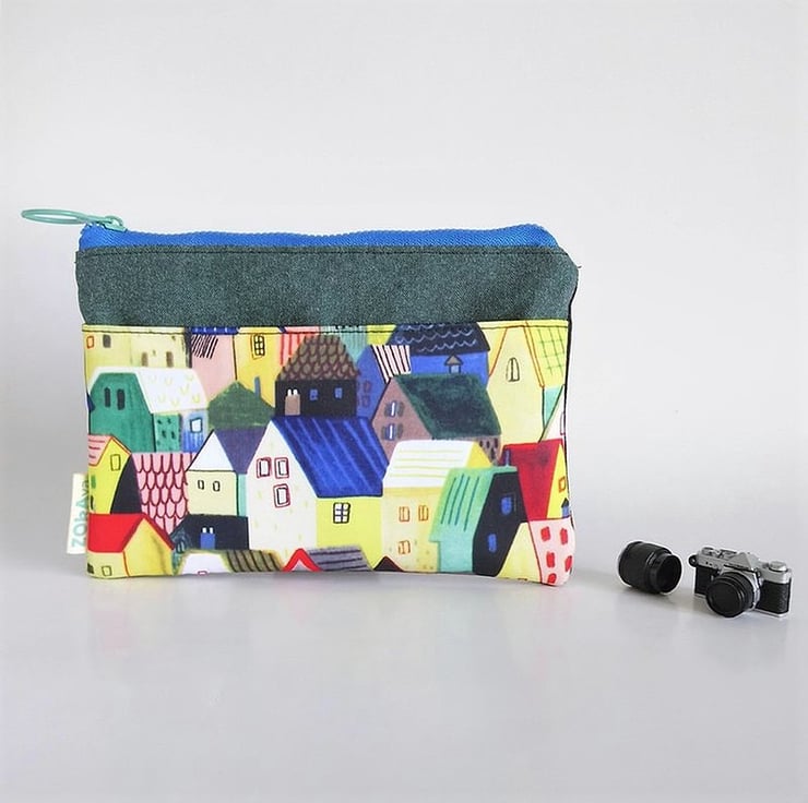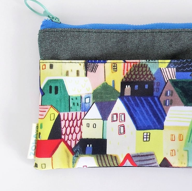 The shell fabric is printed with colorful houses and is full of Scandinavian-feel. Complemented with contrasting coloured fabrics has made this little pouch an eye-catching item.