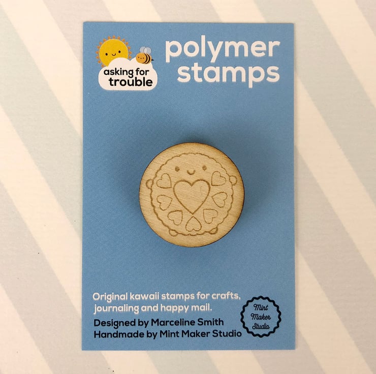 This mini polymer stamp features my happy Jammie Dodger biscuit and is perfect for crafts, journaling, gift wrapping and more. The heart is left open so you can colour it in with a red pen or pencil.
