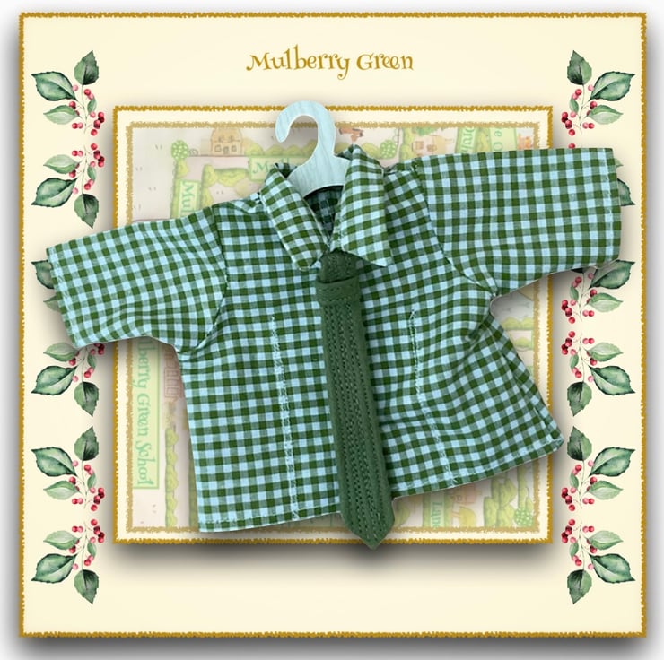 A cute little shirt to fit the Mulberry Green characters. The shirt is made from best quality cotton and has a matching elasticated tie. The shirt fastens with poppers underneath the buttons and looks lovely with the cords or jeans.
