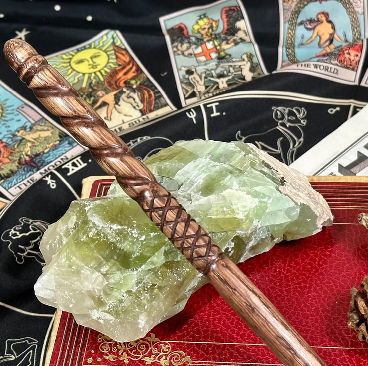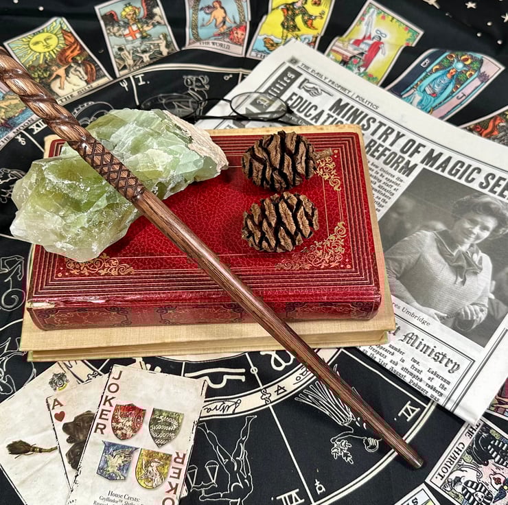 A Ginny Weasley wooden wand inspired from the Harry Potter films. Lovingly turned on a wood lathe then the handle detailing carved by hand. The wood used is Ash. Ash people are kind and generous with a gift for seeing what is beautiful in the world and in others. Will the wand pick you I wonder ?