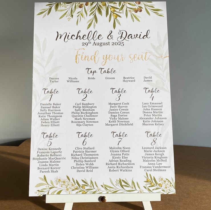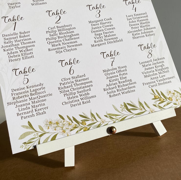 Personalised WEDDING table seating plan A3, A2 and A1 size, Olives branches, leaves, greenery and white flowers, rustic wedding theme design.