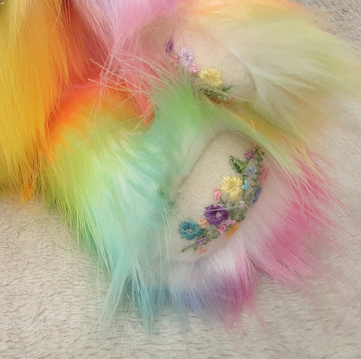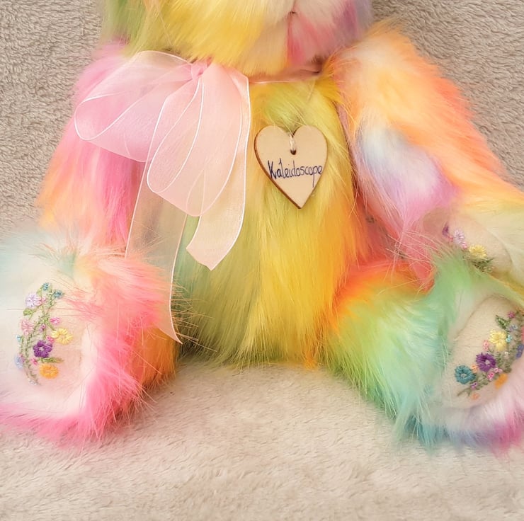 Standing at approx 14'5 " she is a tall traditional bear pattern, her paw pads were made from 100% wool fabric in natural with pretty hand embroidered floral details in rainbow colours to match her fur.