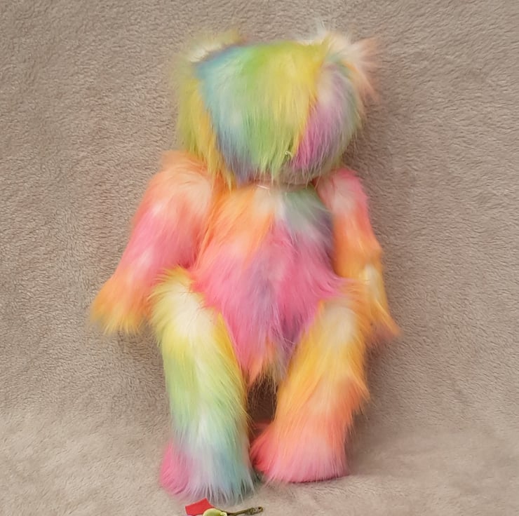 A beautiful handmade artist bear made from gorgeous 50mm pastel luxe rainbow fur, lovely pastel colours on a natural background.