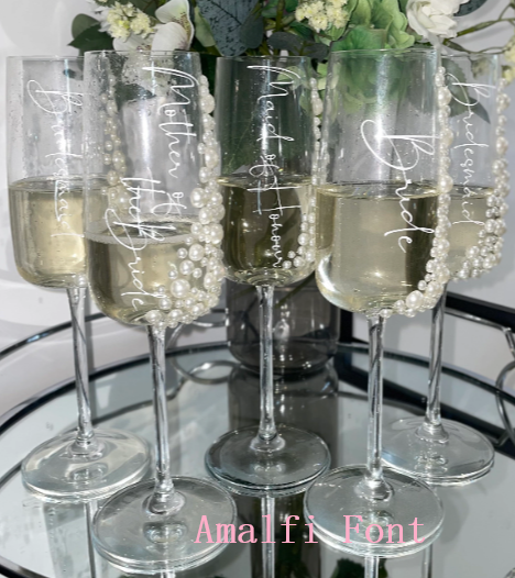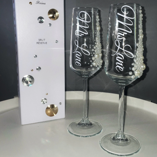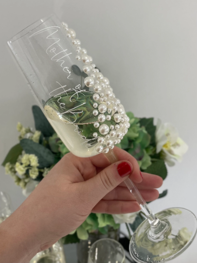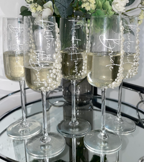 Handmade personalised Pearl champagne flutes. Perfect for any occasion, but lovely as a hen do or morning of the wedding gift! Can also be made for all the wedding party.