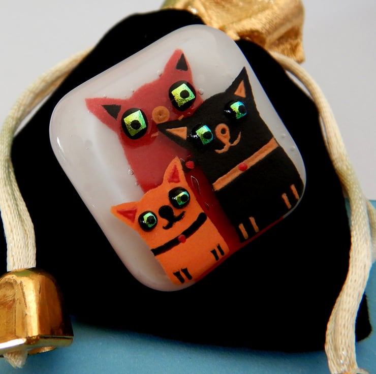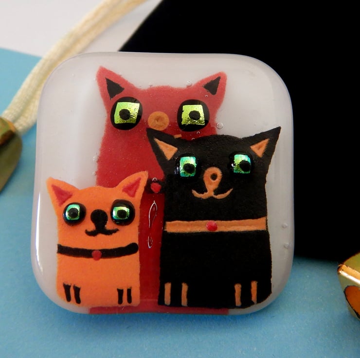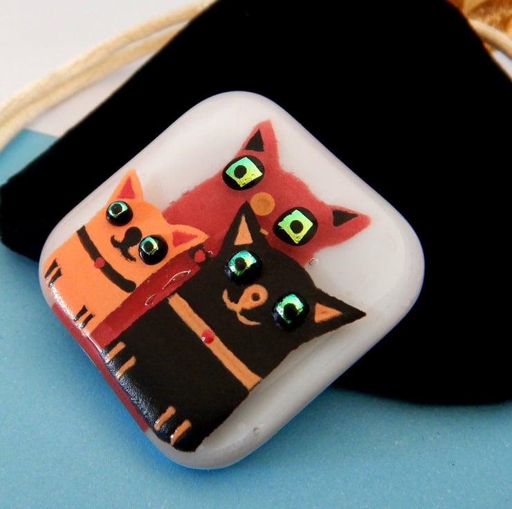 UNIQUE: Handmade Fused Glass 'Cats' Brooch. This brooch has been very carefully made using a combination of: white fusing glass, glassline, dichroic glass, and glass frit. No paint has been used but instead it is very finely ground fusing glass mixed with water. At this stage the blending of colours and adding of details was possible. The brooch is made from two layers of glass giving it a feeling of depth/3D. The brooch was then fired in my kiln and the powdered glass and background fuse to become one piece.