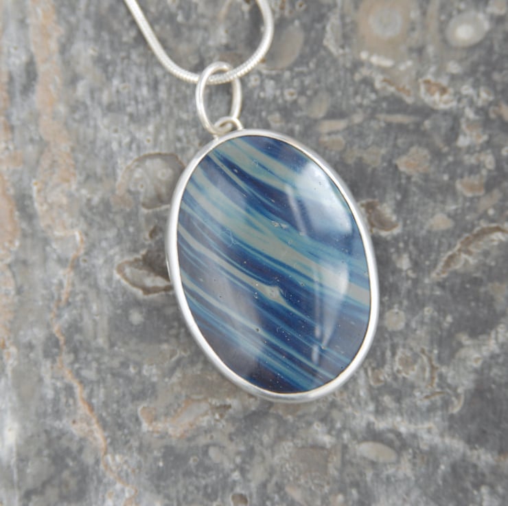 This classical oval shaped pendant is given a twist by featuring unusual Sieber agate smoothly bezel set in sterling silver and finished off with a simple loop bail. Sieber agate isn't actually an agate, it is slag glass from an ancient copper smelting site in Germany that was active about 600 years ago. Impurities from the ore and traces of copper cause the blue and grey colour palette and it's industrial heritage causes the swirly pattern and little air bubbles/ dimples on the surface. It's unusual and sure to be a talking point. Measures approx 40mm (inc bail) by 23mm wide, comes with an 18inch sterling silver chain but the bail could easily take a leather or cotton cord if you wanted to swap it over. Comes in a gift box.