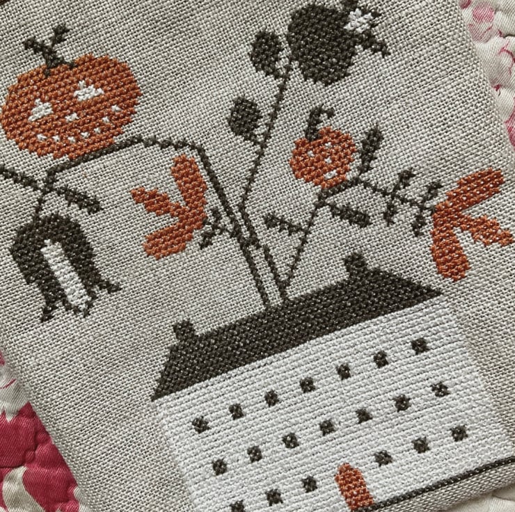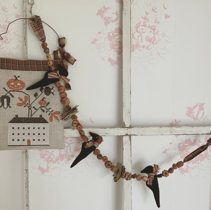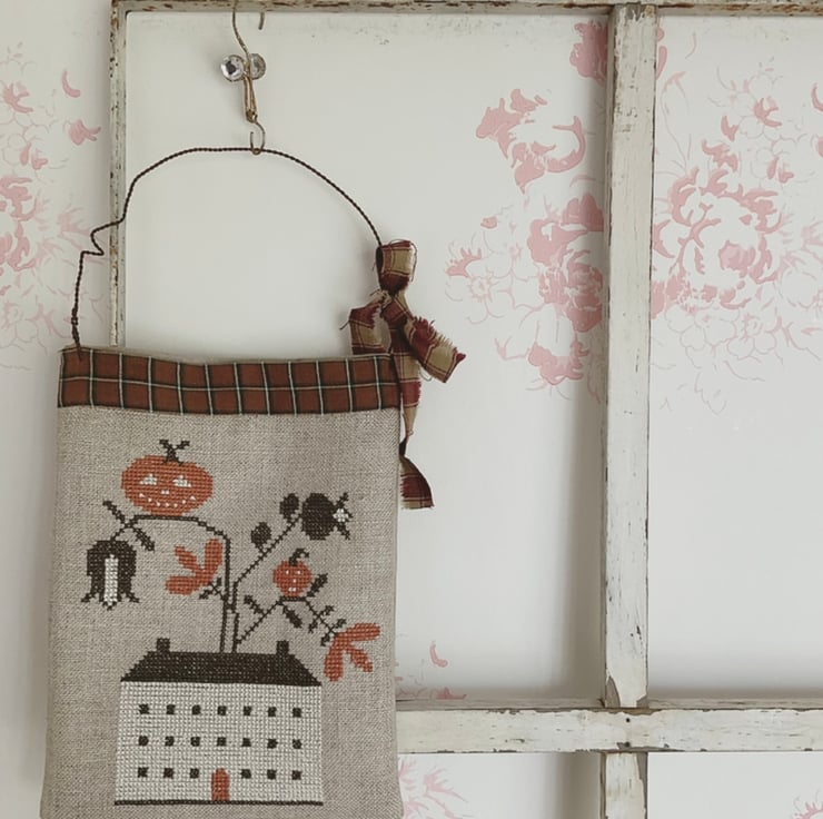 A gorgeous hanging pocket which is decorated with a Halloween cross stitch embroidery on counted linen and backed with plain linen. The hanging loop is a rusty twisted wire with a homespun fabric tie. The front top edge is bound with homespun fabric.